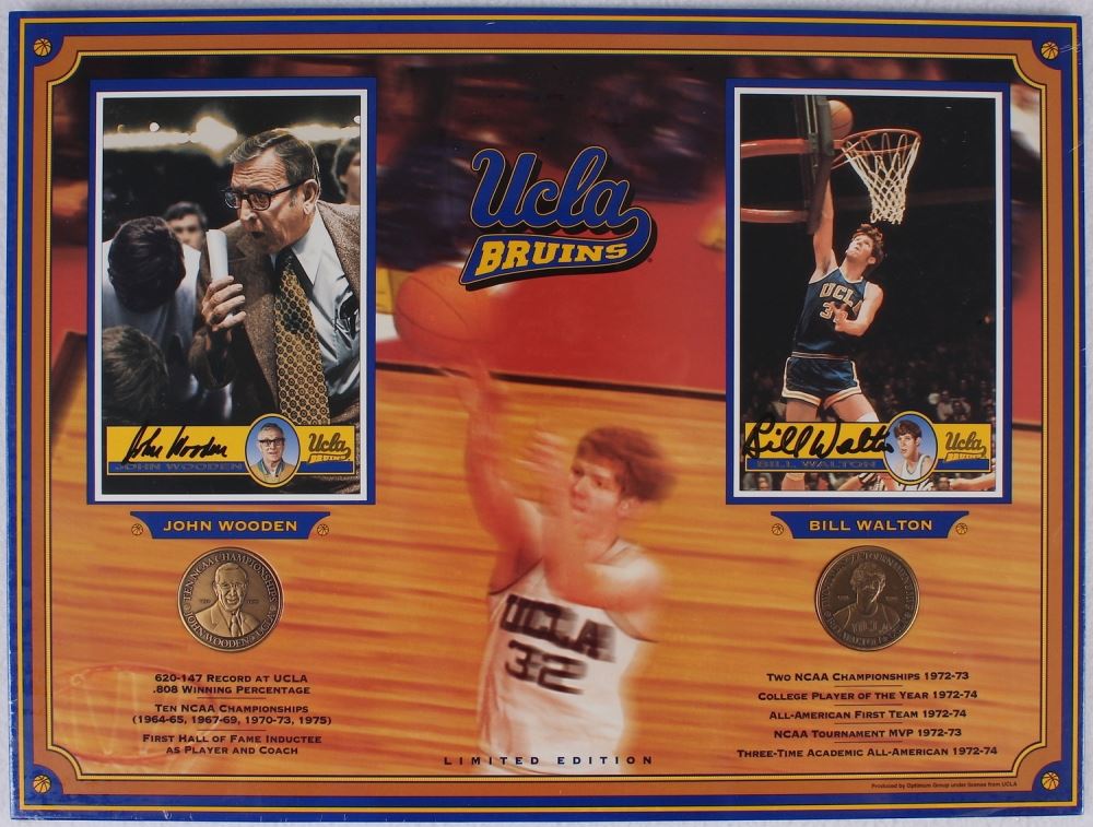 Custom display measures 12" x 16" in size and has been hand-signed in black felt-tip pen by Bill Walton (Celtics HOF) and John Wooden (D 2010, HOF). Display also includes 2 commemorative bronze coins. Autographs include an official COA from Optimum Group who conducted the autograph signing.