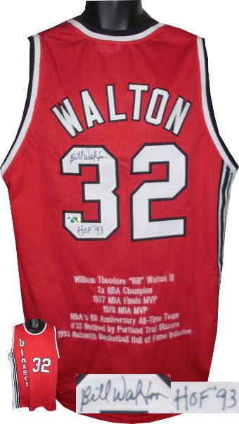 Bill Walton had a prominent career in the NBA where he was a league Most Valuable Player (MVP) and won two NBA championships. Walton was inducted into the Naismith Memorial Basketball Hall of Fame on May 10, 1993. This is a Bill Walton Portland Trail Blazers signed Red unlicensed custom-prostyle jersey with HOF 93 inscription, with Embroidered Stats and with twill stitched nameplate and numbers. Size XL. MAB Hologram and Certificate of Authenticity From Athlon Sports.