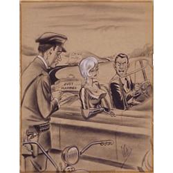 CAN YOU LOOK ME IN THE EYE AND SAY YOU WOULDN'T BE RUSHING TOO!, ink, charcoal and pencil drawing on paper, signed, tape residue around the recto perimeter. $400/600