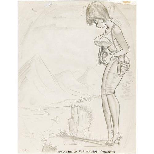 <B>Bill Ward Calendar Preliminary Sketch Original Art (1965).</B></I> Ward's women have special "problems", as seen in this humorous calendar sketch, noted as being from July, although "May" is also penciled in red in the corner. Whatever the month, a Ward cutie is always a welcome sight! Graphite and opaque white, on cream-colored 8.5" x 11" paper. In Very Good condition.