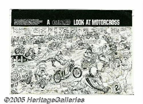 <B>Bill Ward - Cracked, Splash Pages 26 and 27 Original Art (Globe Communications, undated).</B></I> Rev up your engines as we take "A Cracked Look at Motocross," with art by Bill Ward. This double-page spread was produced for <B>Cracked</B></I>, one of the oldest humor magazines, and the only surviving competitor of <B>Mad</B></I>. Ward has had a highly prolific career, having penciled thousands of pages for books ranging from <B>Captain Marvel</B></I> and <B>Blackhawk</B></I>, to his own creation, <B>Torchy</B></I>. But Ward eventually moved away from the comic book field, gracing men’s magazines with his instantly recognizable renditions of the female form. And in 1954, he joined <B>Cracked</B></I> where he stayed for many years. The image area of this piece measures 23" x 16", and although there is some glue staining overall, the art is in Good condition.