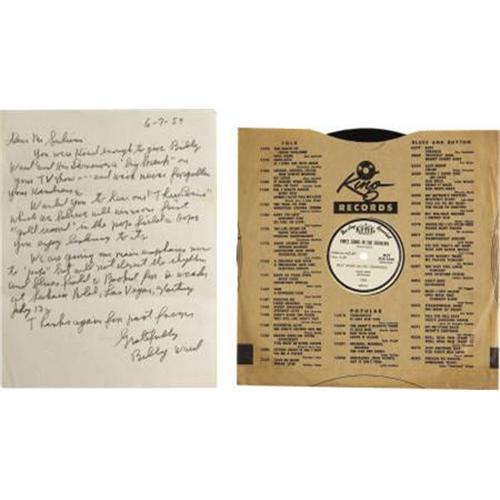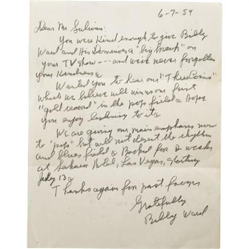 <B>Bill Ward and His Dominoes Promo 78 and Handwritten Letter (King 1364, 1954).</B></I> The legendary R&B group had first recorded in 1950, and by the mid '50s had begun stringing together hits on the Pop charts. The talent was always there -- lead vocalists included first Clyde McPhatter, then Jackie Wilson. But their crossover success was also helped by an appearance on the Ed Sullivan show in 1954. Included with this lot is a handwritten letter from Ward, dated June 7, 1954, to Sullivan thanking him for having the group on his show. Ward included a promo copy of his latest single, "Three Coins In The Fountain," suggesting it would help the band win their "first gold record in the pop field." Ward signed the four paragraph letter "Gratefully, Billy Ward." (See a close-up at our website!). The rare white label promo ("Dee Jay Special") copy on King 1364 has "Lonesome Road" as its B-side, and is in very nice condition at EX 7. <I>Accompanied by a COA from PSA/DNA.</B></I><BR><BR><b>Shipping:</b> Recordings (<a target="_blank" href="http://www.heritageauctions.com/common/shipping.php">view shipping information</a>)