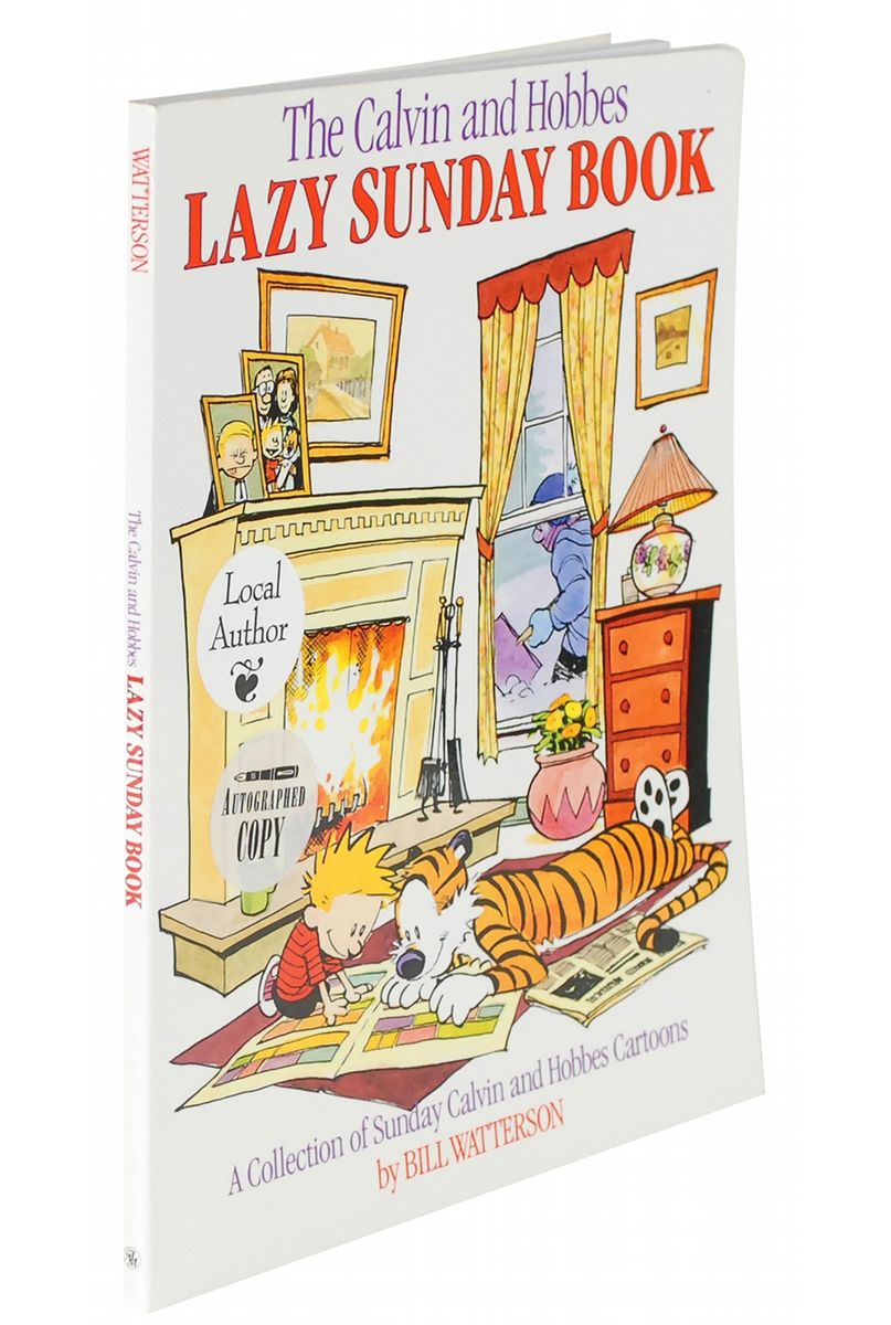Signed book: The Calvin and Hobbes Lazy Sunday Book. Later printing. Kansas City: Andrews and McMeel, 1989. Softcover, 8.5 x 10.75, 125 pages. Signed on the title page in blue felt tip. In fine condition, with two bookshop labels affixed to the front cover. Watterson’s reclusive nature has made his autograph quite scarce.