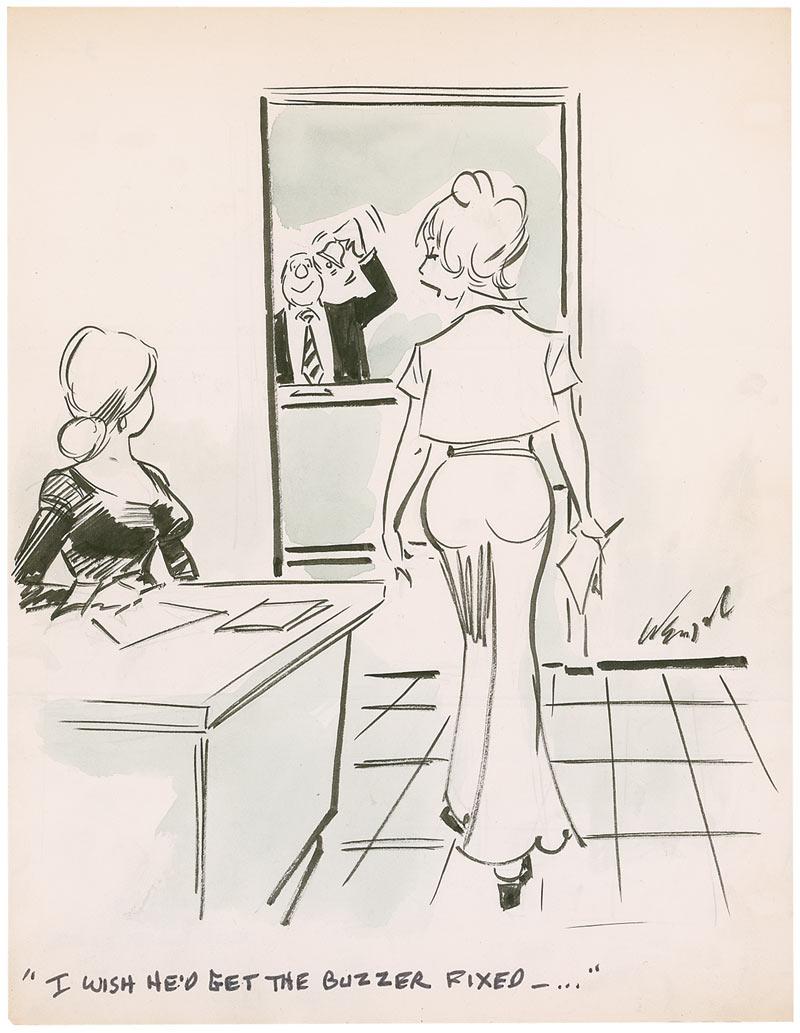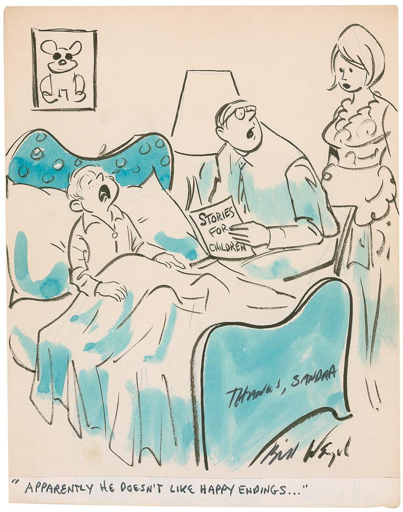 Two original hand-inked and watercolor one panel cartoon, both on off-white sheets approximately 8.5 x 11, including one slightly off-color, one signed “Wenzel,” and one signed and inscribed “Thanks Sandra, Bill Wenzel.” In very good condition, with uniform toning to one cartoon, which also has a pasted on caption.