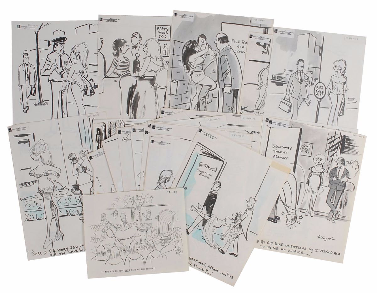 Salacious set of nineteen Bill Wenzel sketches depicting various promiscuous scenes made famous in Playboy magazine, each approximately 8.5 x 11, all but one signed “Wenzel.” Each sketch is accomplished in India ink and bears a humorous handwritten caption along the lower border, with many affixed. All are stamped on the reverse with Wenzel’s personal address, and many bear Singer Communications labels to upper left corner. Also includes one printed and one photocopy sketch. In overall fine condition.