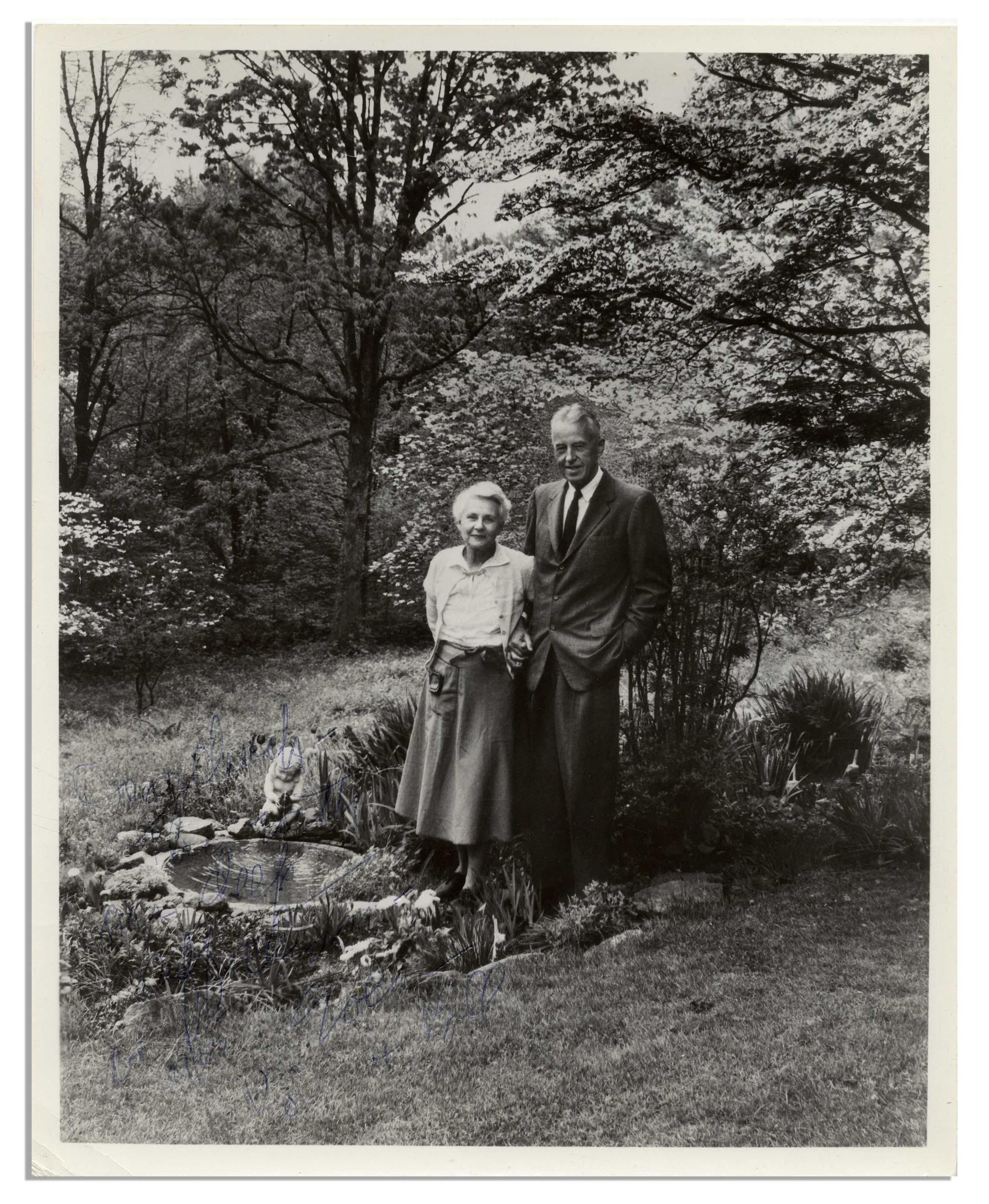 Alcoholics Anonymous co-founder Bill Wilson signed and inscribed 8'' x 10'' glossy photo, depicting Wilson and his wife posing outdoors. Inscription reads: ''Dear Chuck, This with our deep affection -- Ever Lois & Bill / BH Aug. 29 / 65''. The Chuck that Wilson writes to is Chuck Gibian whom Wilson sponsored in AA. Signed at lower left, in a dark area of photo, making the signature somewhat difficult to read. Very good condition.