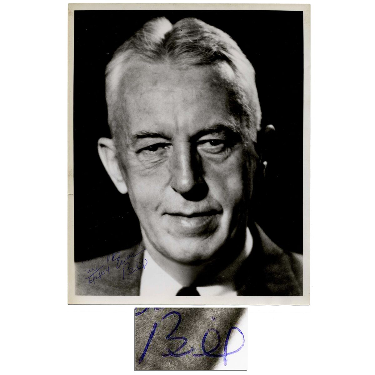 Alcoholics Anonymous co-founder Bill Wilson 8'' x 10'' glossy photo, signed and inscribed: ''Dear Chuck, With all affection / Ever Bill / 6/2/64''. The Chuck that Wilson writes to is Chuck Gibian whom Wilson sponsored in AA. In blue ink, first part of inscription is written on the black background making it less visible, though date and signature are written on a lighter portion, providing good contrast. Small .25'' tear along left border and minor creasing at top, else near fine condition.