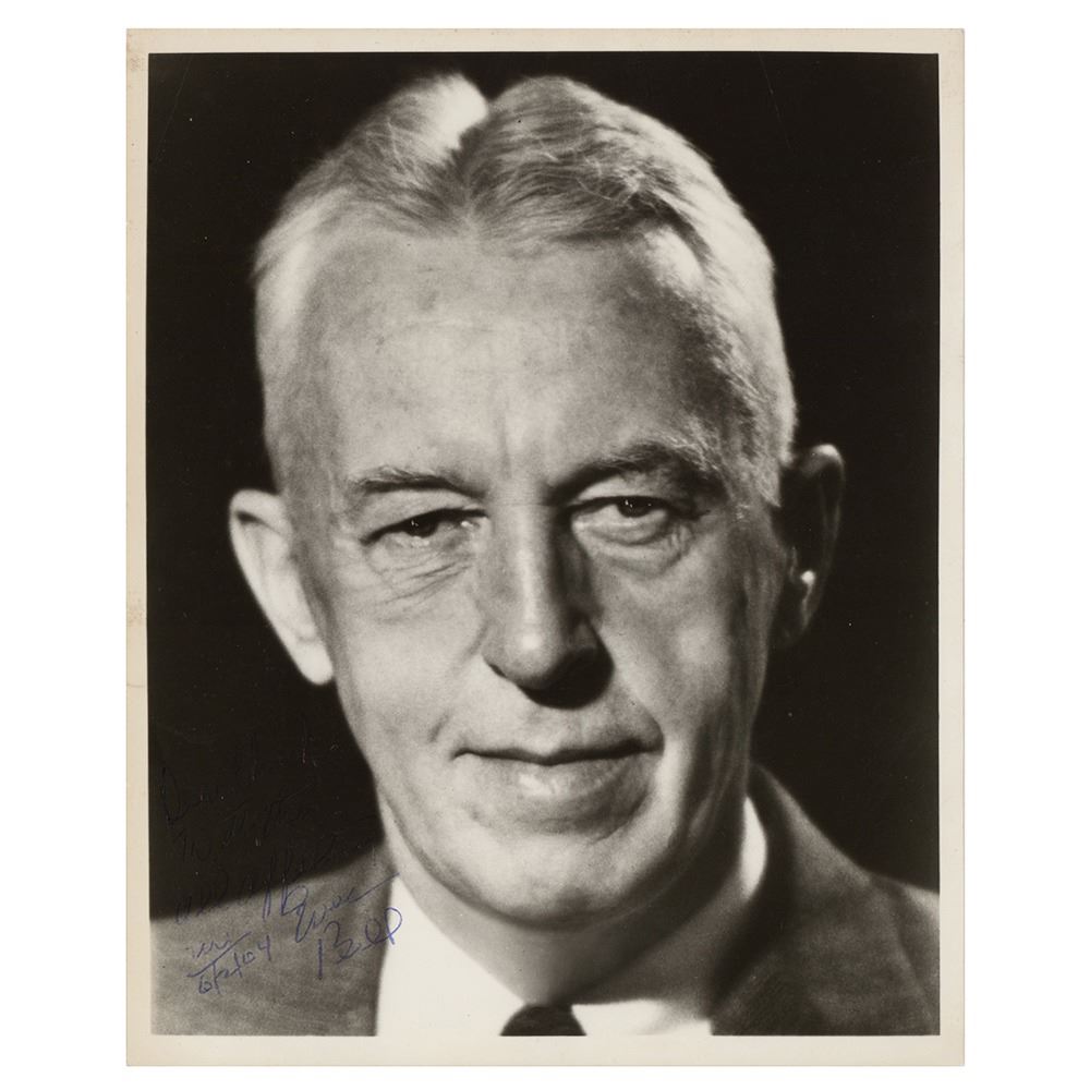 Uncommon glossy 8 x 10 close-up photo of the Alcoholics Anonymous co-founder, signed and inscribed in blue ballpoint, "Dear Chuck, With all affection, Ever, Bill 6/2/64." In very good to fine condition, with a bit of light creasing, some surface impressions above Wilson's right ear, and poor contrast to the inscription.