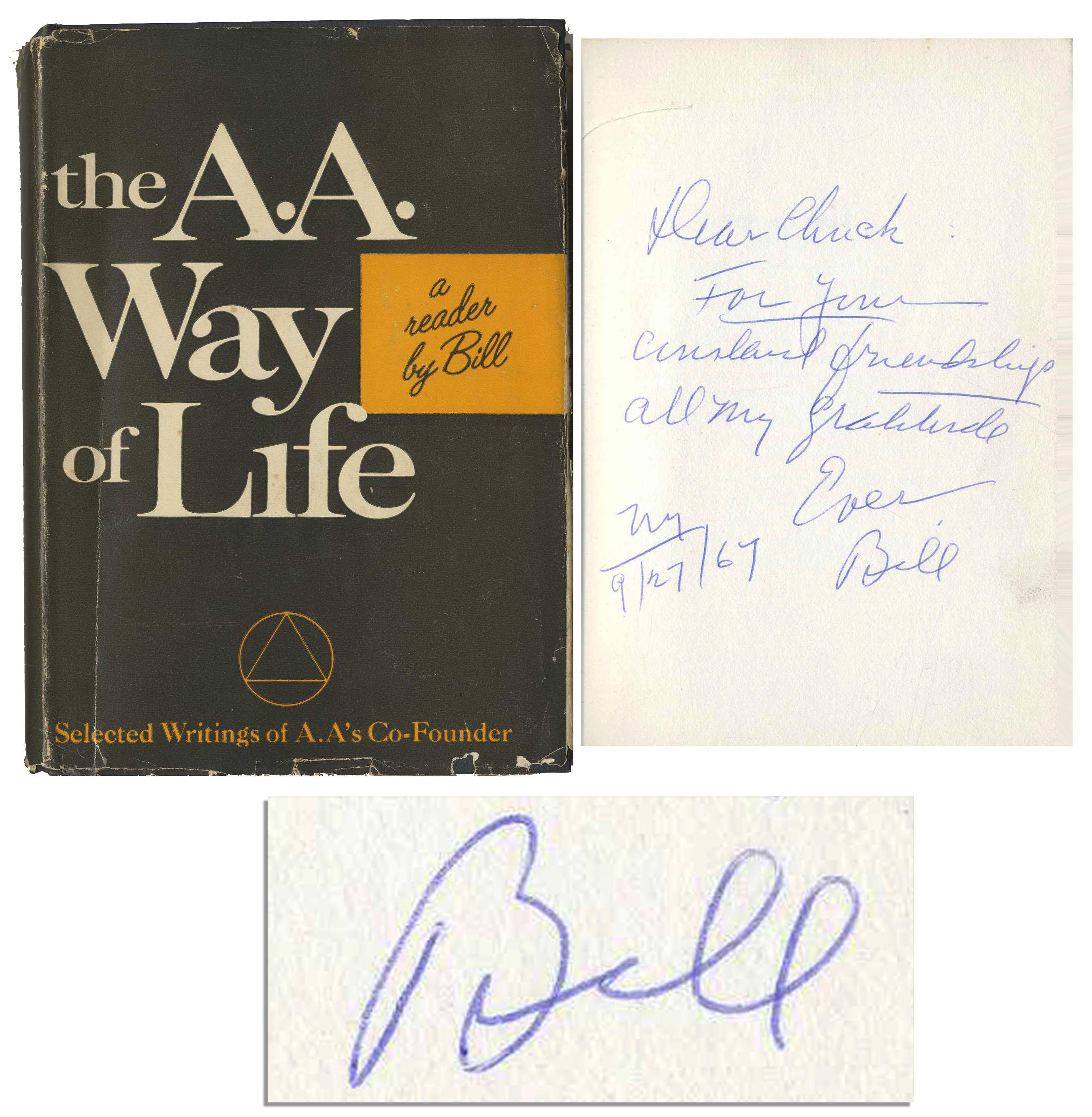Very rare first edition of ''The A.A. Way of Life: A Reader by Bill'' signed by Bill Wilson. New York: Alcoholics Anonymous World Services, Inc.: 1967. Inscribed by Wilson to front free endpaper: ''Dear Chuck: For your constant friendship all my gratitude / Ever Bill / NY 9/27/67''. The Chuck that Wilson writes to is Chuck Gibian whom Wilson sponsored in AA. Includes original dustjacket with minor chips to edges. Gray cloth bound book measures 4.25'' x 6.25''. Missing first 14 page section (seemingly a printing error), else near fine.