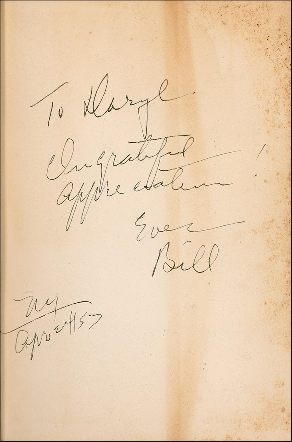 Co-founder of Alcoholics Anonymous (1895–1971), the treatment program which has helped millions of people recover from a disease long stigmatized and regarded as irreversible. Signed book: Alcoholics Anonymous. First edition, later printing. NY: Works Publishing Inc., 1951. Hardcover with reproduction eighth printing dustjacket, 6 x 8.25, 400 pages. Signed and inscribed on the first free end page, “To Darryl, In grateful appreciation! Ever, Bill, NY Apr 57.” In very good condition, with toning and foxing to signed page vertically passing through the signature and inscription, mild toning to inside pages, light toning and foxing to pastedowns, and moderate partial sunning to spine. The reproduction dustjacket exhibits light wear and creasing, with a small repaired tear to spine. Signed copies of this book’s first edition are decidedly rare.