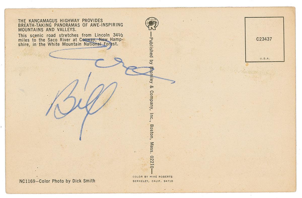 Co-founder of Alcoholics Anonymous (1895–1971), the treatment program which has helped millions of people recover from a disease long stigmatized and regarded as irreversible. Color 5.5 x 3.5 postcard photo of a scenic view from the Kancamagus Highway in New Hampshire, signed on the reverse in fountain pen, “Ever, Bill.” In fine condition, with light, even toning and scattered soiling, with one spot over the last letter of his name.