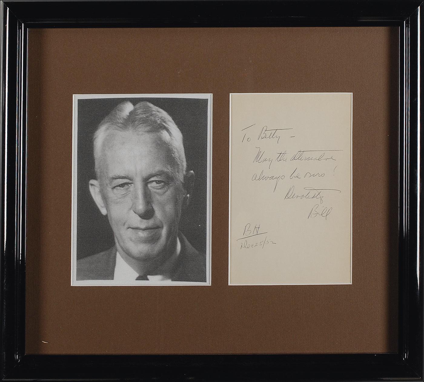 Co-founder of Alcoholics Anonymous (1895–1971), the treatment program which has helped millions of people recover from a disease long stigmatized and regarded as irreversible. Ballpoint signature and inscription, “To Betty – May the alternative always be ours! Devotedly, Bill, BH Dec25/52,” on an off-white 4.5 x 6.75 blank book page. Matted and framed with a laser print portrait of Wilson, to an overall size of 16 x 13.5. In fine condition.