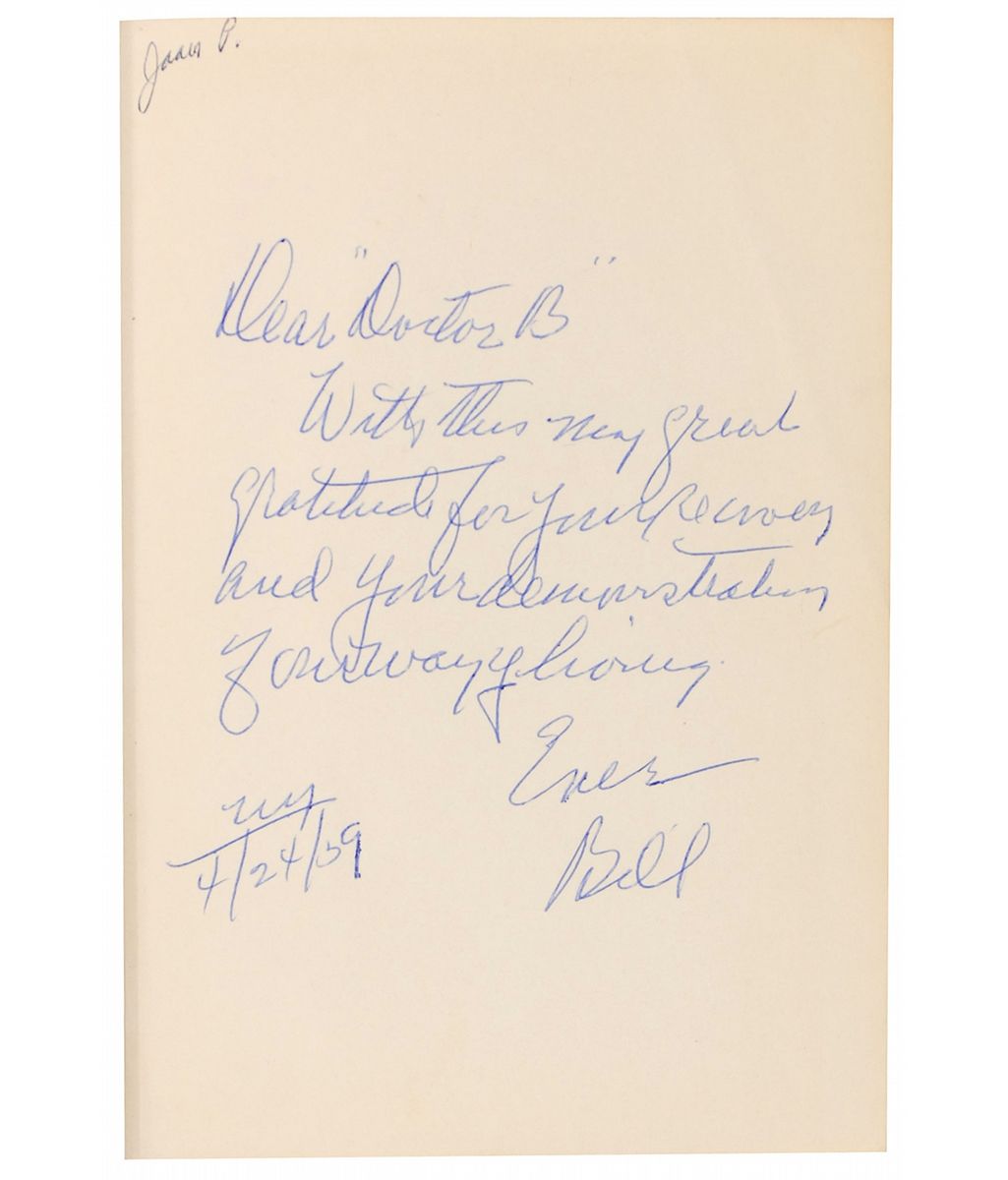 Co-founder of Alcoholics Anonymous (1895–1971), the treatment program which has helped millions of people recover from a disease long stigmatized and regarded as irreversible. Signed book: Alcoholics Anonymous. First edition, 16th printing. NY: Alcoholics Anonymous Publishing, Inc., 1954. Hardcover with reproduction dust jacket, 6.25 x 8.25, 400 pages. Signed and inscribed on the first free end page, “Dear ‘Doctor B,’ With this my great gratitude for your recovery and your demonstration of our way of living. Ever, Bill, NY 4/24/59.” A second inscription on the front pastedown, done in an unknown hand, reads, “Dr. B. Thanks for your part in making this possible to represent Central Michigan as its Delegate for the 1959 Conference here in New York City.” Apparently the “Dr. B.,” who received this book was a delegate to the 1959 conference also attended by Wilson. It is very unlikely that it refers to Dr. Bob Smith, the co-founder of the organization. Autographic condition: fine, with a small ownership signature to top of signed page. Book condition: VG-/VG (reproduction jacket).