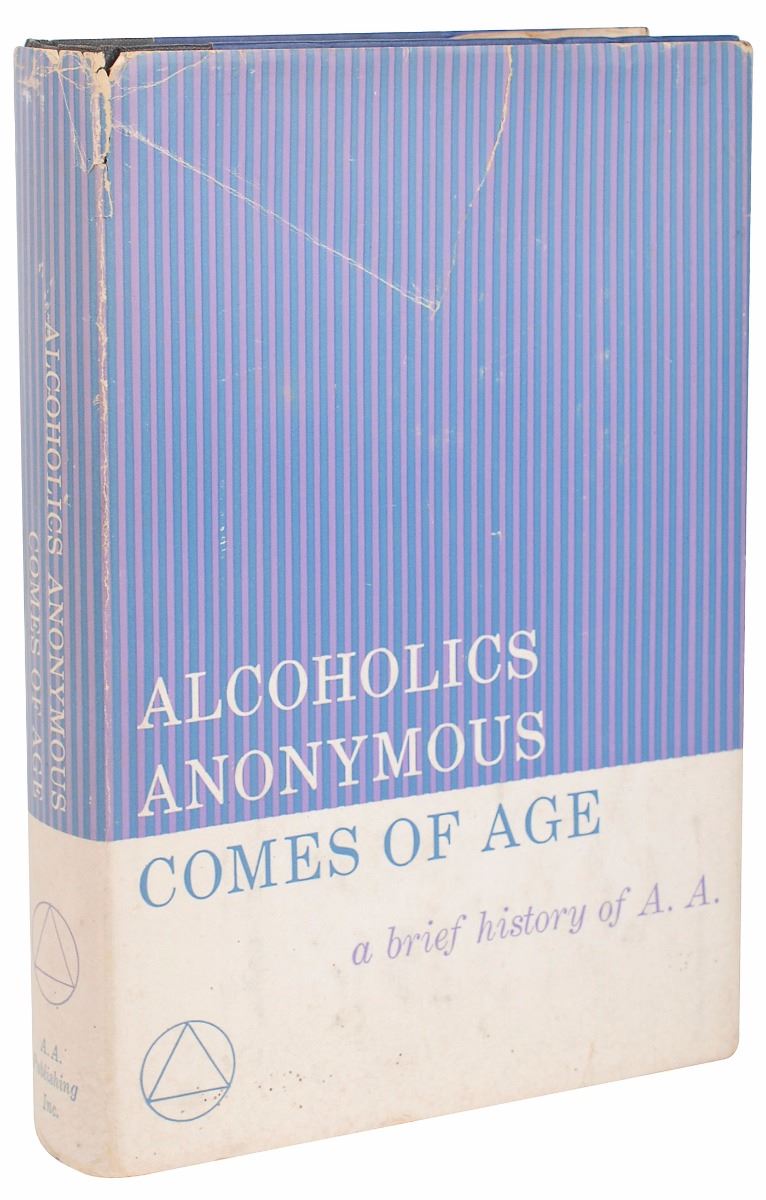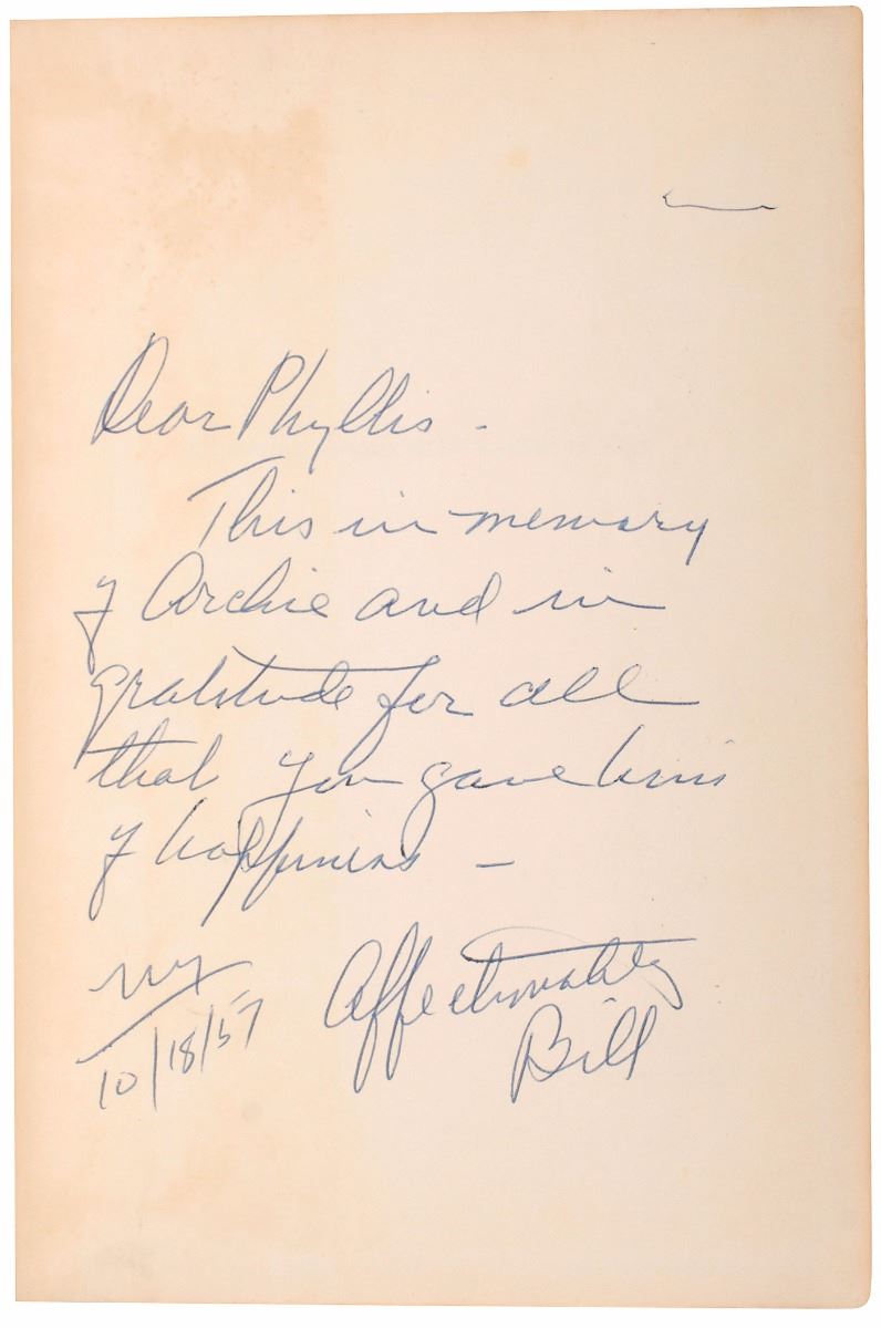 Signed book: Alcoholics Anonymous Comes of Age. First edition. NY: Alcoholics Anonymous Publishing, Inc., 1957. Hardcover with dust jacket, 6 x 8.5, 335 pages. Signed and inscribed on the first free end page in blue ballpoint, “Dear Phyllis—This in memory of Archie and in gratitude for all that you gave him of happiness—Affectionately, Bill. NY, 10/18/57.” Autographic condition: scattered toning and a stray ballpoint mark to the signed page, otherwise fine. Book condition: VG/VG-.