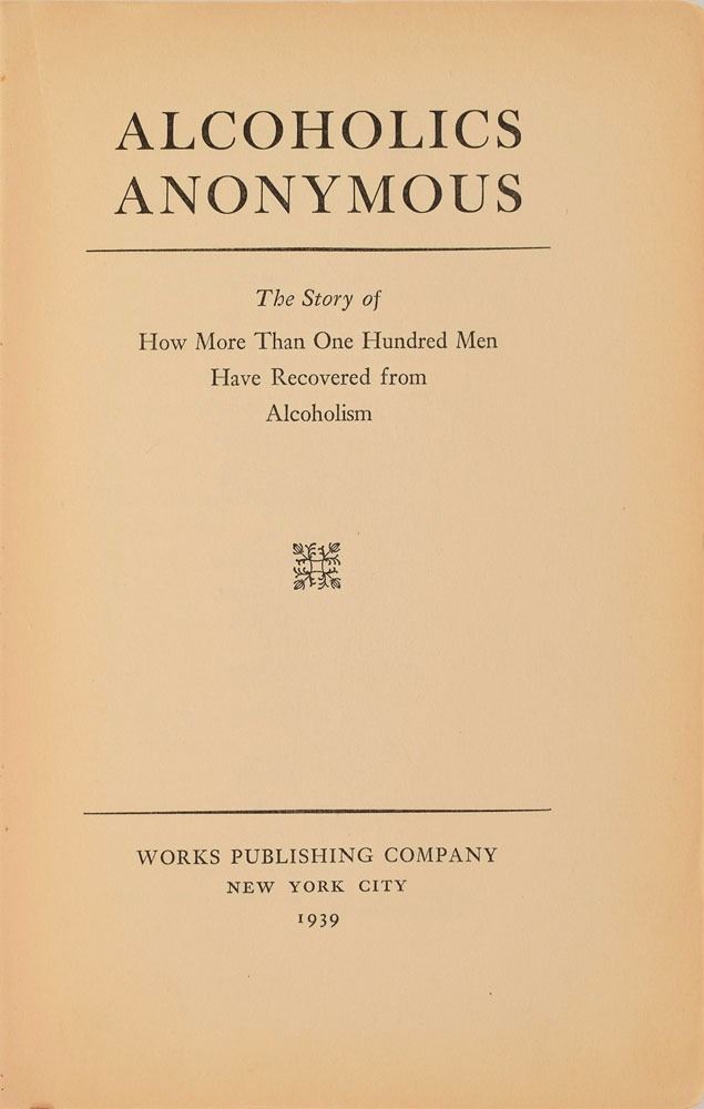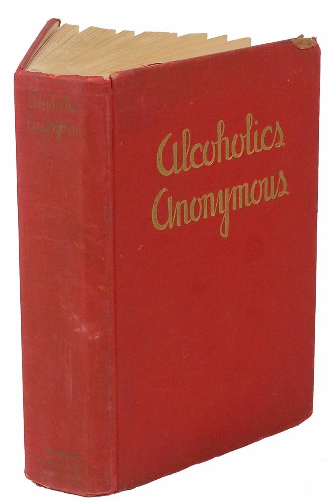 Rare unsigned book: Alcoholics Anonymous. First edition, first printing. NY: Works Publishing Company, 1939. Hardcover, 6.25 x 9.25, 400 pages. Book condition: G+/None. Red cloth-covered boards with gilt titles; edges heavily worn, with tears in cloth and boards exposed in several places; spine sunned; rubbing and moderate soiling to exterior; front hinge split at title-page, with half-title detached but present; couple other interior hinges cracked; textblock edges and endpapers yellowed; previous owner’s inscription to front pastedown. A title that has changed millions of lives, first printings of this book are incredibly hard to find and highly sought-after.