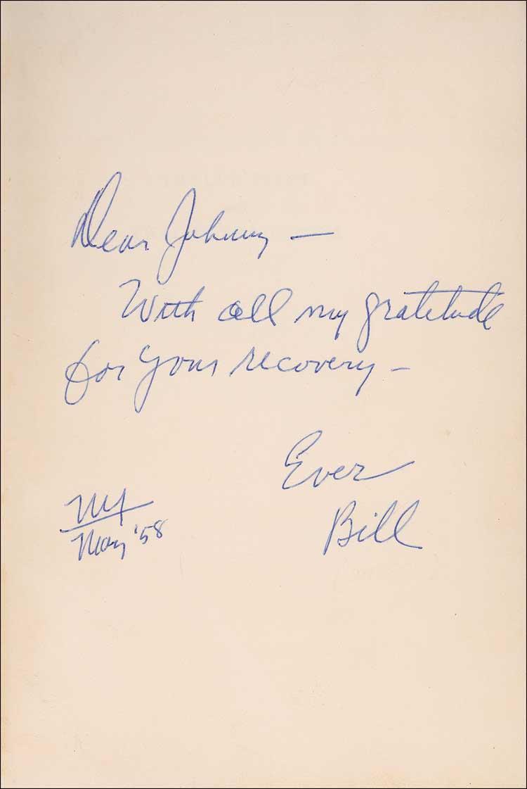 Signed book: Twelve Steps and Twelve Traditions. Later printing. Alcoholics Anonymous Publishing, Inc., 1953. Hardcover with dustjacket, 5.75 x 8.5, 192 pages. Signed and inscribed in blue ballpoint on the first free end page, “Dear Johnny—With all my gratitude for your recovery—Ever, Bill, NY, May ‘58.” This “other” Big Book, Wilson’s appropriately anonymous follow-up to the historic Alcoholics Anonymous (1939), contains a detailed discussion of the program’s famous twelve steps, as well as the “twelve traditions” that were codified during the group’s formative years. In fine condition, with scattered toning and foxing to inside pasteboards, and some scattered wear and creases to dustjacket and spine. A handsome copy of a title uncommon in signed examples. Pre-certified PSA/DNA and RRAuction COA.