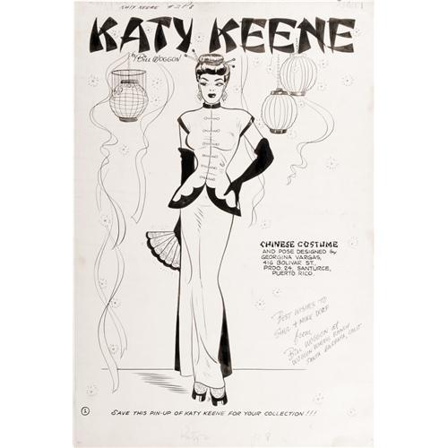 <B>Bill Woggon - Katy Keene #2, page 8 Pin-Up Original Art (Archie, 1950).</B></I> Lovely starlet, Katy Keene, strikes a pretty pose in her Chinese costume designed by fan/reader Georgina Vargas of Puerto Rico. Bill Woggon showcases his tremendous talent for "good girl" art, making this a superb showpiece for any Katy Keene admirer. This piece was signed and inscribed to well-known fan Shel Dorf at the lower right. The overall size of this pulchritudinous pin-up measures 13.5" x 20", and the art is in Excellent condition. <BR><BR><b>Shipping:</b> Flat Material, Large (<a target="_blank" href="http://www.heritageauctions.com/common/shipping.php">view shipping information</a>)