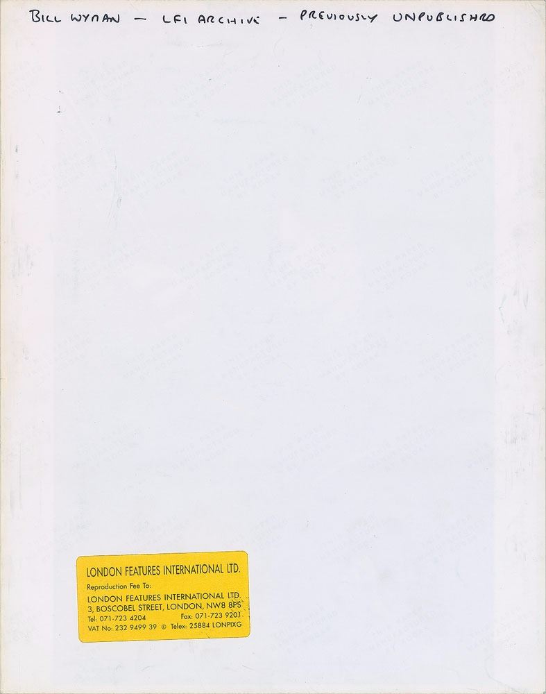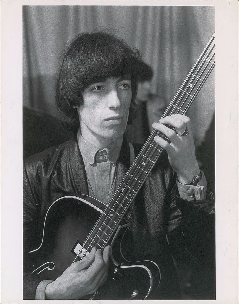 Attractive original matte-finish 9.5 x 12 silver gelatin close-up photo of Bill Wyman playing his bass guitar. Reverse bears a London Features International label and is annotated along the top edge, “Bill Wyman—LFI Archive—Previously Unpublished.” In fine condition, with some wear to borders, easily matted out. From the Globe Photo archives.