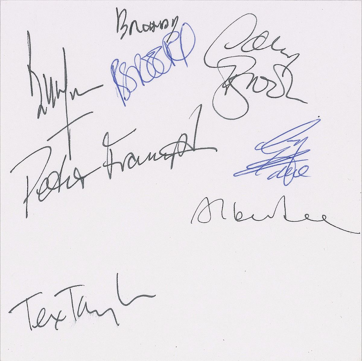 Ink and ballpoint signatures of members of Bill Wyman’s Rhythm Kings, including: Bill Wyman, Peter Frampton, Albert Lee, Tex Taylor, Gary Brooker, Graham Broad, and two others on a white 4.75 x 4.75 sheet. In fine condition.