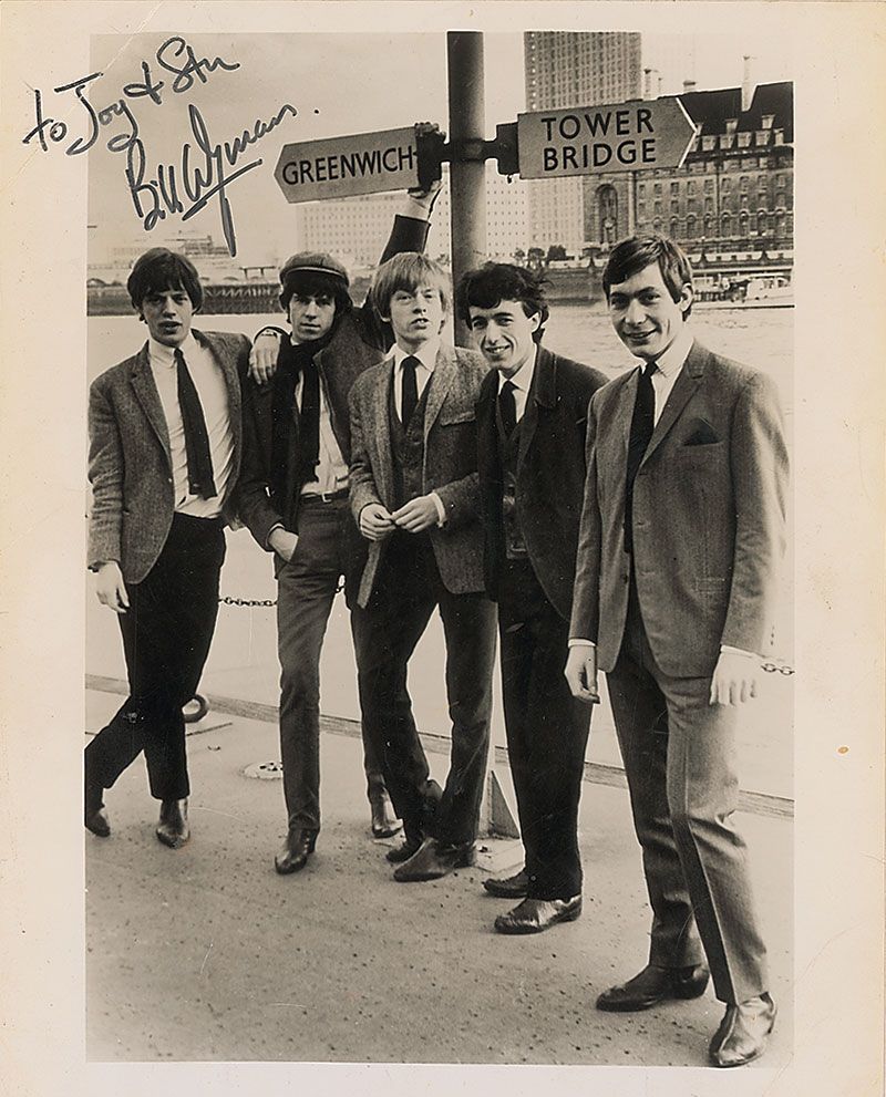 Vintage glossy 8 x 10 photo of the five original Stones posing by a street sign, signed and inscribed in black felt tip “To Joy & Stu, Bill Wyman.” In very good condition, with scattered surface marks and creases, one passing through beginning of inscription.