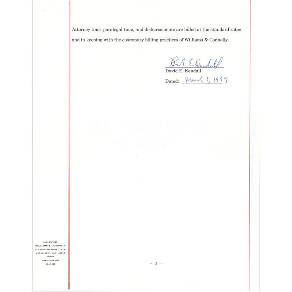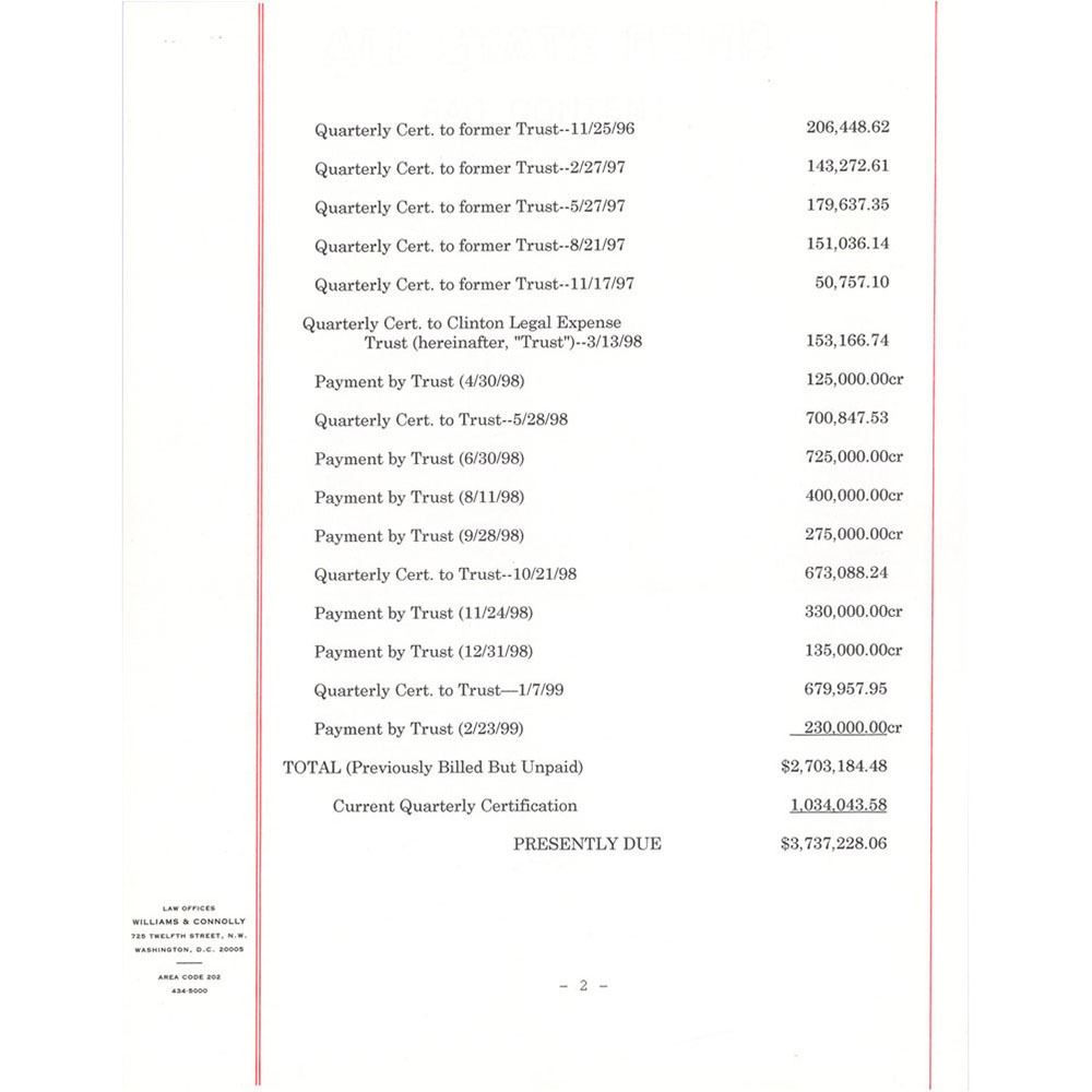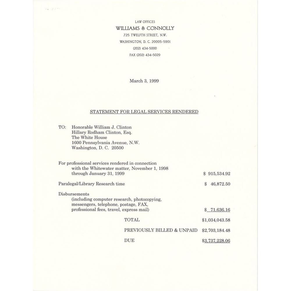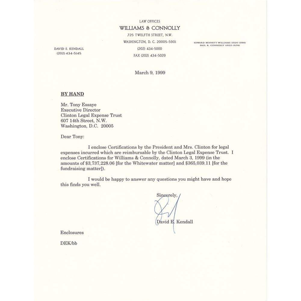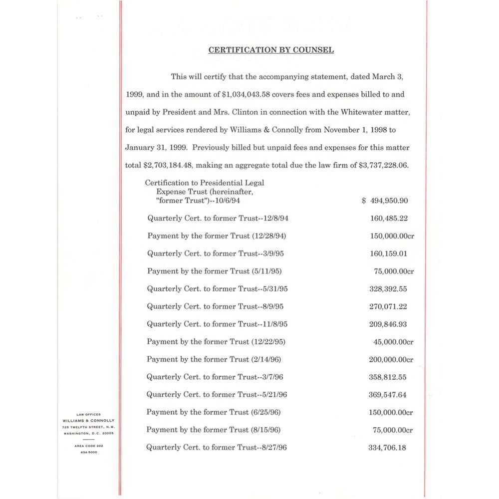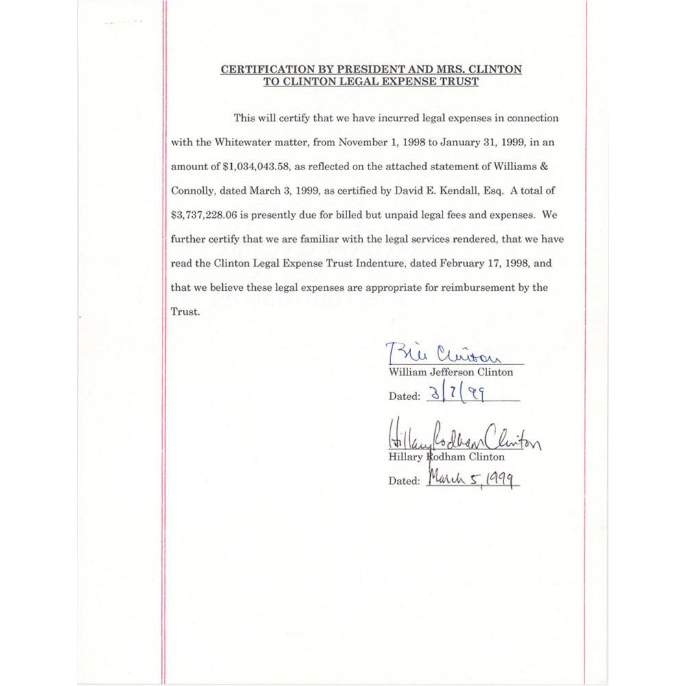 DS, signed as president, "Bill Clinton," and as first lady, "Hillary Rodham Clinton," one page, 8.5 x 11, individually dated March 5 and 7, 1999. In full: "This will certify that we have incurred legal expenses in connection with the Whitewater matter, from November 1, 1998 to January 31, 1999, in an amount of $1,034,043.58, as reflected on the attached statement of Williams & Connolly, dated March 3, 1999, as certified by David E. Kendall, Esq. A total of $3,737,228.06 is presently due for billed but unpaid legal fees and expenses. We further certify that we are familiar with the legal services rendered, that we have read the Clinton Legal Expense Trust Indenture, dated February 17, 1998, and that we believe these legal expenses are appropriate for reimbursement by the Trust." Signed and dated at the conclusion in blue ink by the president, and signed and dated below in black ballpoint by the first lady. In very fine condition. Both the Williams & Connolly Statement for Legal Services Rendered and the Certification by Counsel are included, totaling five additional pages; two are signed by David E. Kendall, the attorney best remembered for having advised President Bill Clinton during the Lewinsky scandal, and for representing him during his impeachment trial.