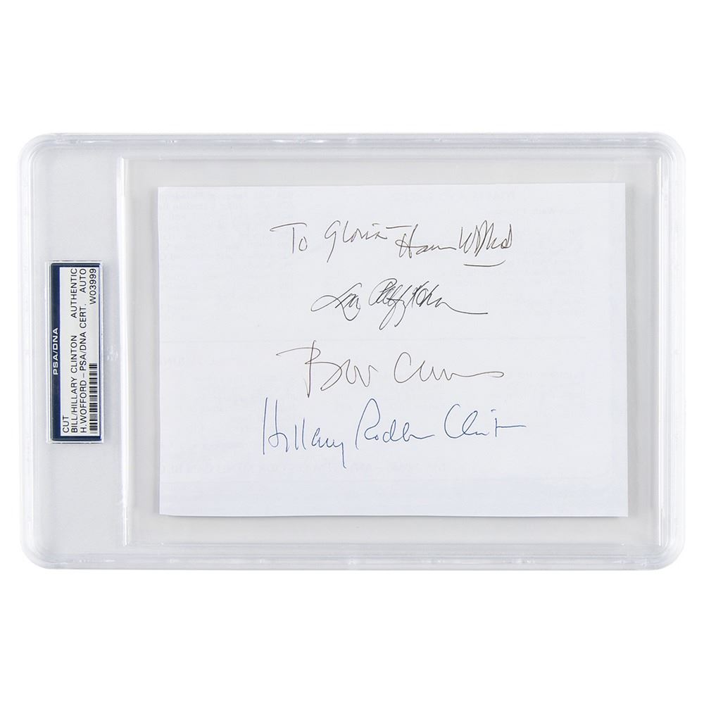 Ballpoint signatures, "Bill Clinton" and "Hillary Rodham Clinton," on the reverse of a clipped 7 x 5 section of a restaurant menu. Also signed and inscribed by Harris Wofford and one other. In fine condition, with light show-through from the menu text on the back. Encapsulated in a PSA/DNA authentication holder.
