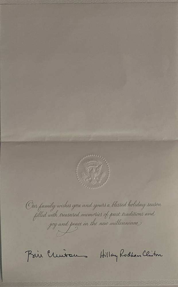Bill and Hillary Clinton facsimile signed Christmas card. 5x7 inches