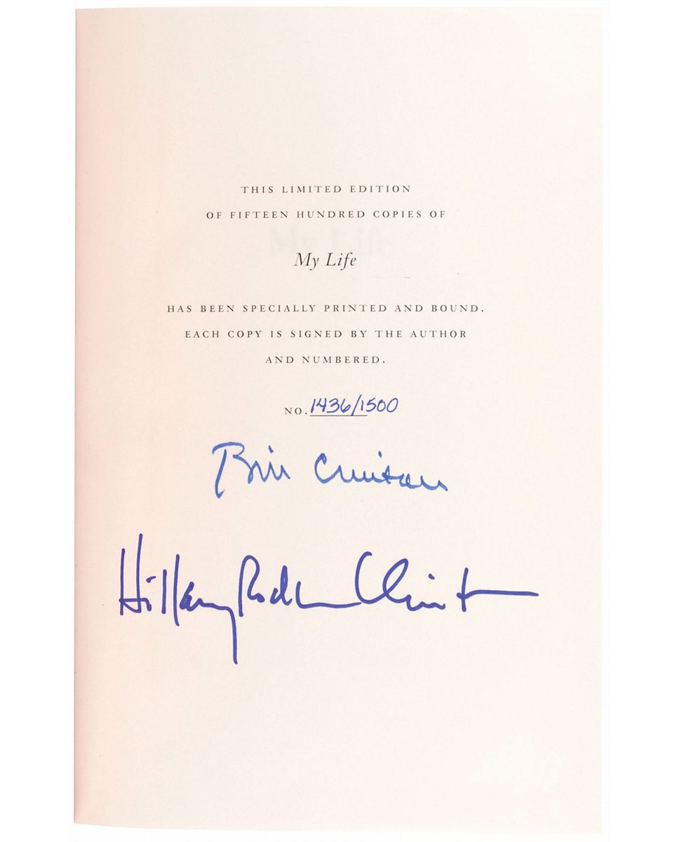 Signed book: My Life. Limited edition, numbered 1436/1500. NY: Alfred A. Knopf, 2004. Hardcover with slipcase, 6.5 x 9.25, 957 pages. Signed on the colophon in blue felt tip, “Bill Clinton” and “Hillary Rodham Clinton.” In fine condition. This book was issued only with Bill Clinton’s autograph, and the consignor was able to obtain Hillary’s signature in person at Abbott Northwestern Hospital on June 1, 2007.
