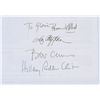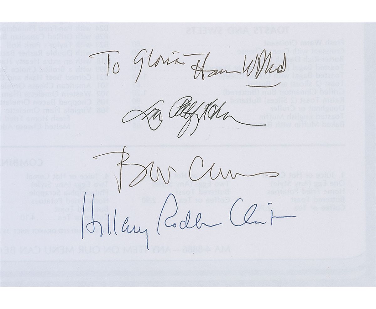 Ballpoint signatures, “Bill Clinton” and “Hillary Rodham Clinton,” on the reverse of a clipped 7 x 5 section of a restaurant menu. Also signed and inscribed by Harris Wofford and one other. In fine condition. Accompanied by eight photos and a note indicating that this was signed on November 3, 1992, the day Clinton was elected to his first term as president, when he stopped by the Mayfair Diner in Philadelphia that morning.