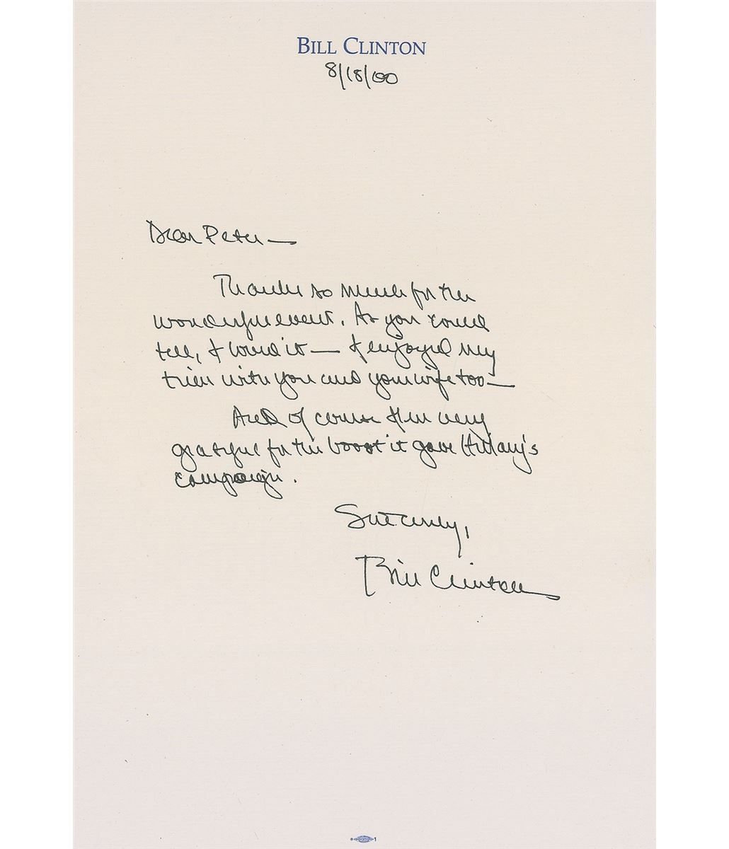 Two letters, each one page, 7.25 x 10.5, personal letterhead, dated August 18, 2000, and addressed to Peter Paul. First, an ALS from Bill Clinton as president, in full: “Thanks so much for the wonderful event. As you could tell, I loved it—I enjoyed my time with you and your wife too—And of course I’m very grateful for the boost it gave Hillary’s campaign.” Second, a TLS from Hillary Clinton as first lady, signed “Hillary,” in part: “Thank you very much for hosting Saturday night’s tribute to the President and for everything you did to make it the great occasion that it was. We will remember it always.” Hillary also adds a brief postscript in her own hand, “Thanks so much.” In overall fine condition. Accompanied by a certificate of authenticity from University Archives.
