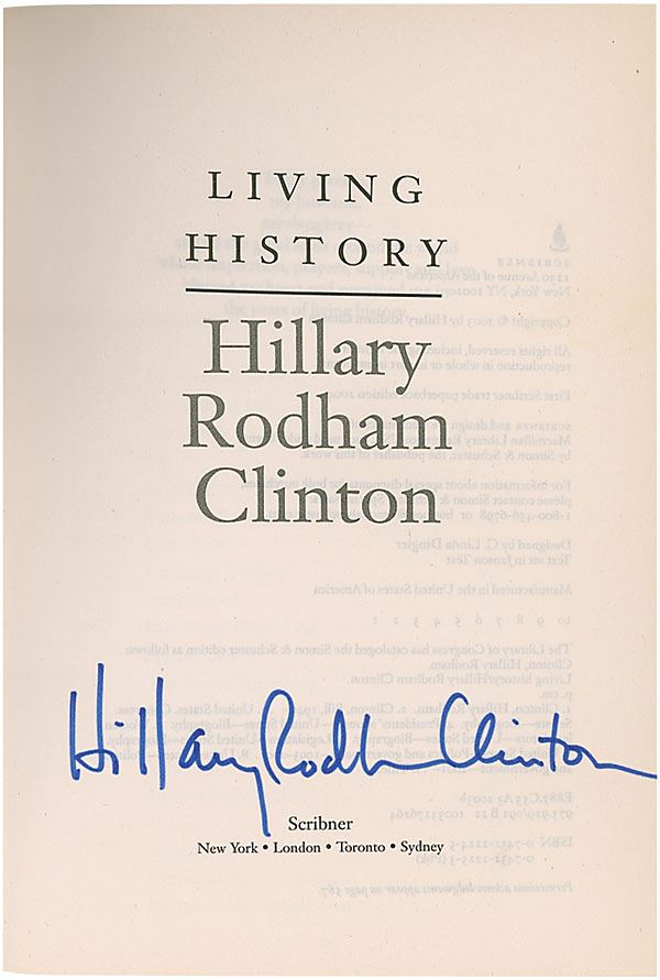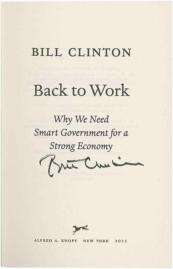 Two books: a hardcover first edition of Back to Work, signed on the title page in black felt tip by Bill Clinton; and a softcover edition of Living History, signed on the title page in blue felt tip, “Hillary Rodham Clinton.” In fine condition, with some light wear to Hillary’s cover.