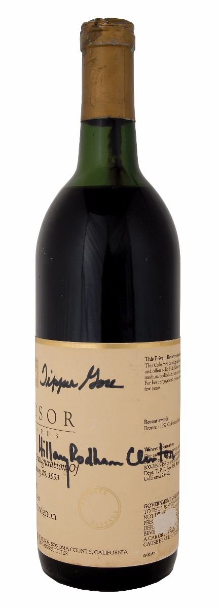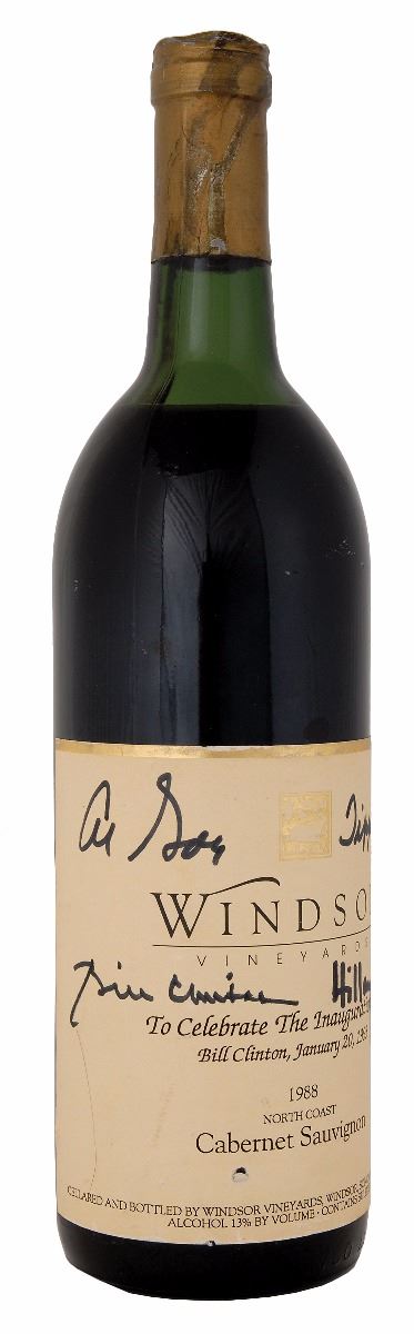 Sealed bottle of Windsor Vineyards 1988 North Coast Cabernet Sauvignon wine served at Clinton’s Inaugural Ball, with the label reading, “To Celebrate The Inauguration Of Bill Clinton, January 20, 1993,” signed on the label in black felt tip by Bill Clinton, Hillary Rodham Clinton, Al Gore, and Tipper Gore. In fine condition, with some wear to the label not affecting signatures. Accompanied by a full letter of authenticity from JSA.