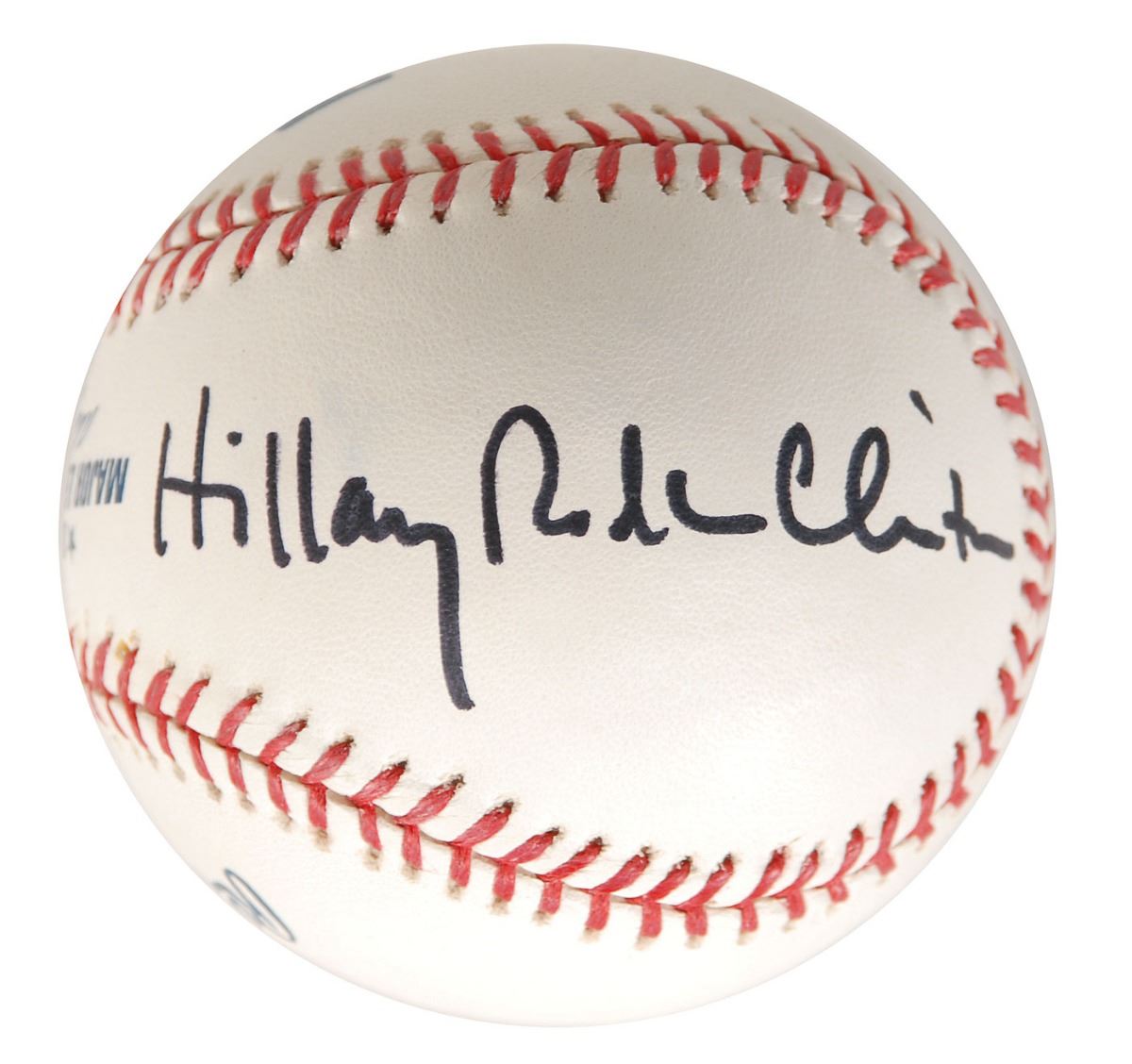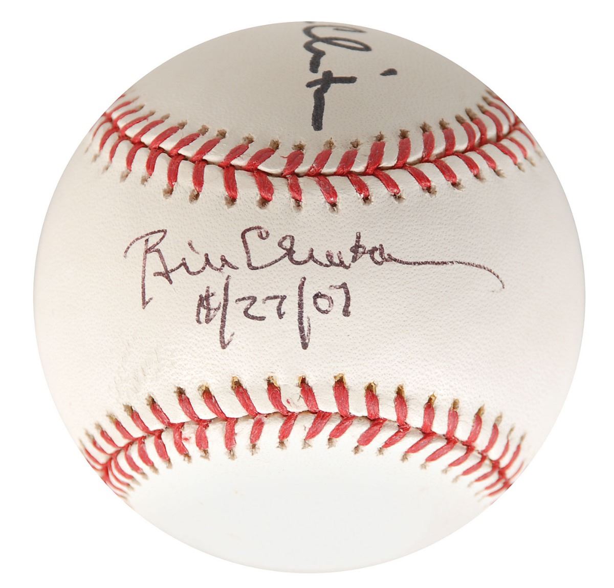 Official Rawlings Major League (Selig) baseball signed in black ballpoint on the sweet spot, “Bill Clinton, 11/27/07,” and in black felt tip on a side panel, “Hillary Rodham Clinton.” In very fine condition. Accompanied by a letter of provenance indicating that Bill signed the ball at a YMCA in Muscatine, Iowa, and Hillary signed the ball at Jumer’s Castle Lodge in Bettendorf, Iowa, in early December 2007.