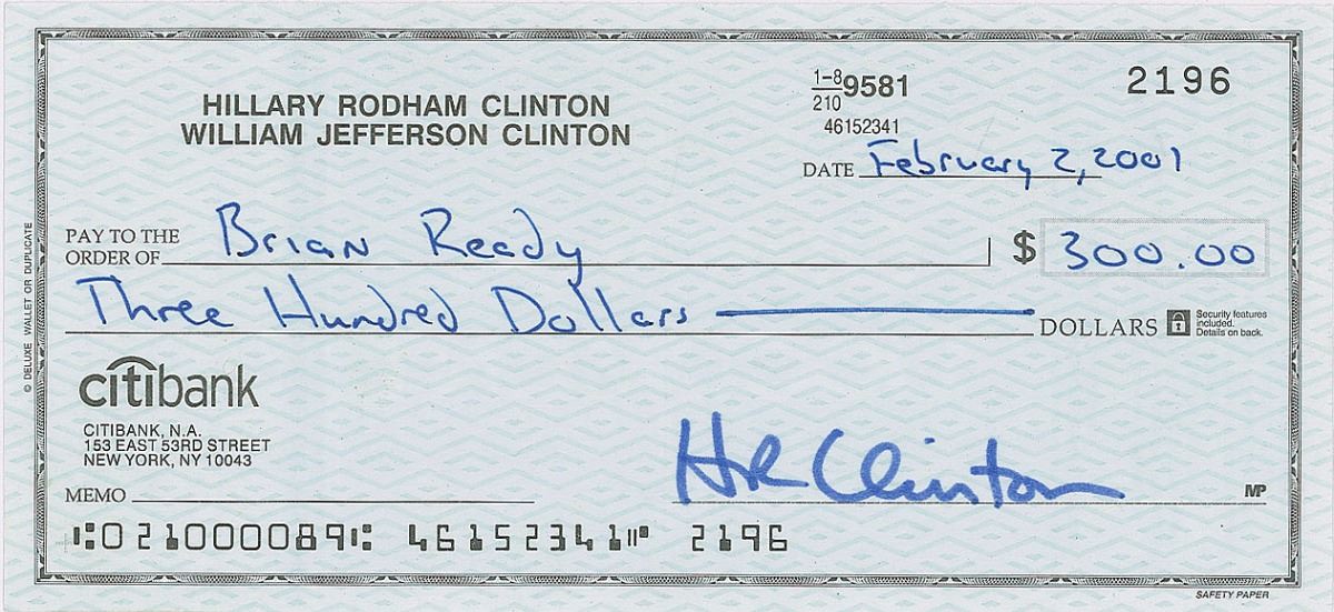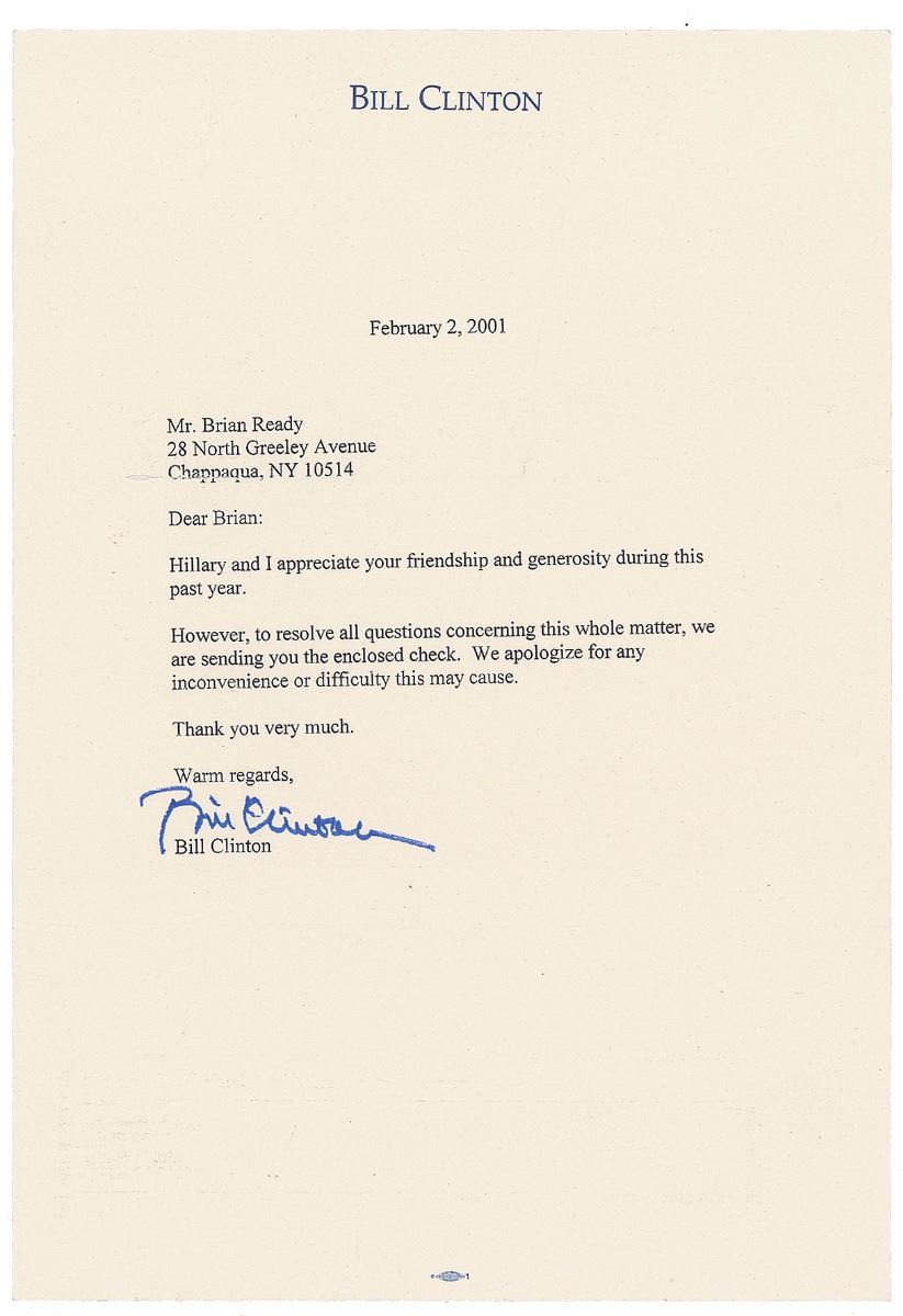 Unusual combination of a TLS and check: an intriguing TLS signed “Bill Clinton,” one page, 7.25 x 10.5, personal letterhead, February 2, 2001. Letter to Brian Ready, in full: “Hillary and I appreciate your friendship and generosity during this past year. However, to resolve all questions concerning the whole matter, we are sending you the enclosed check. We apologize for any inconvenience or difficulty this may cause. Thank you very much.” Includes the aforesaid personal check, 6 x 2.75, filled out in another hand and signed by Hillary Clinton, “H. R. Clinton,” payable to Brian Ready for $300, February 2, 2001. In overall fine condition. Accompanied by the original mailing envelope, as well as a provenance letter from Ready, dated November 20, 2009, in full: “I managed The Scarborough Gallery in Chappaqua, NY in 2000, where the Clinton’s had bought a home when Bill went out of office. An art salesman told me to buy a painting of a chocolate lab he had that looked like Buddy (their dog) and to give it to the Clinton’s as a ‘welcome to the neighborhood’ gift, which I did. I never heard anything until a few months later when I got a call from the Whitehouse [sic] asking me what the value of the painting was. Bill Clinton did wind up doing some picture framing with me, nothing big just repairs and small jobs. A few months after the call my name started coming out in all these newspapers (along with Sylvester Stallone and Jack Nicholson) as part of the $190k in gifts they had to return to people or pay for when Bill went out of office. A while after that I received this apology letter from Bill and the $300 check signed by Hillary.”