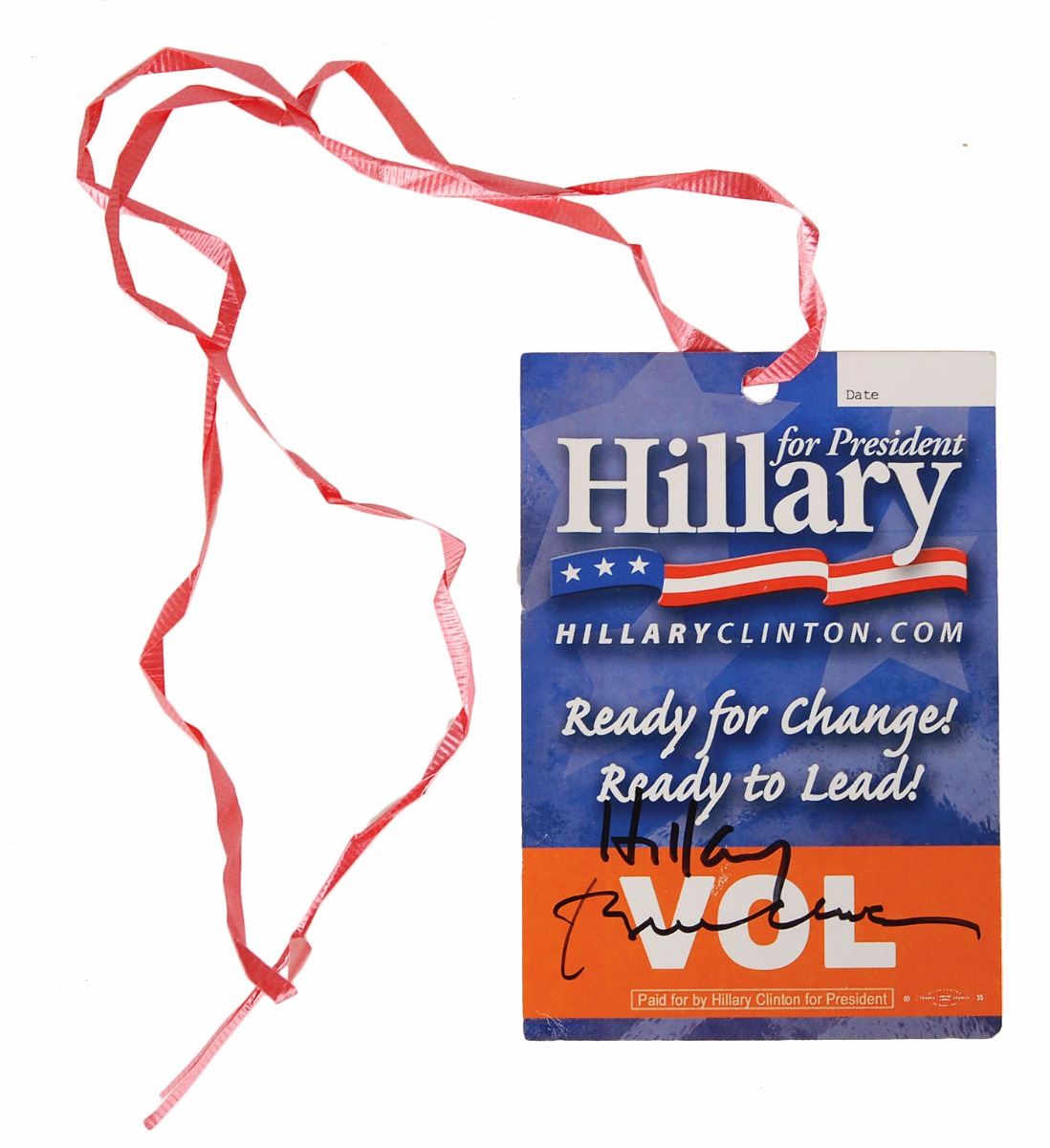 Colorful ‘Hillary for President’ campaign event pass with original ribbon, 3.25 x 5, signed in black felt tip, “Hillary” and “Bill Clinton.” In fine condition.