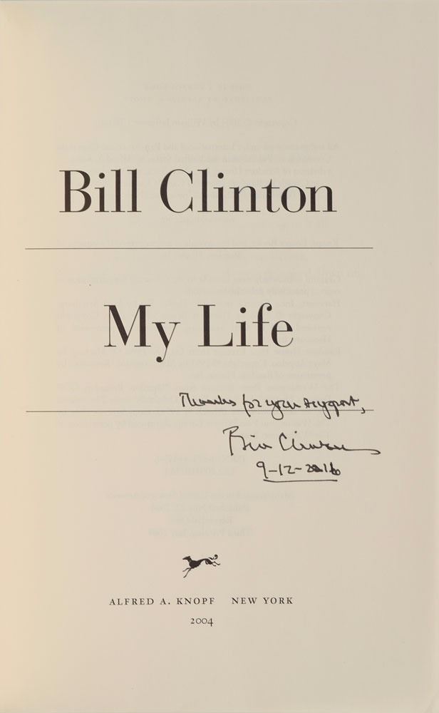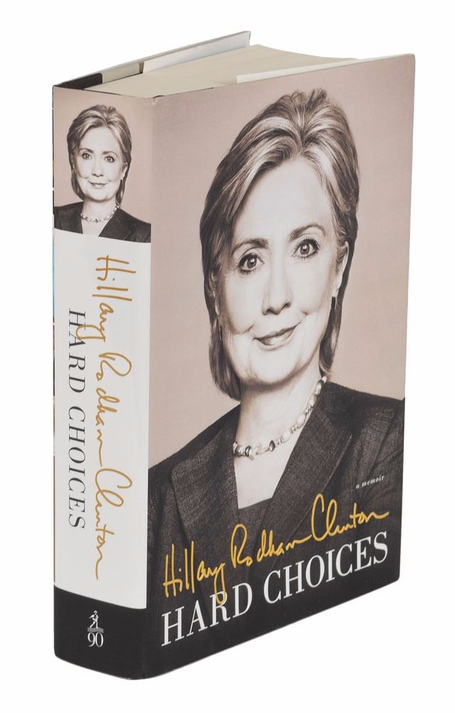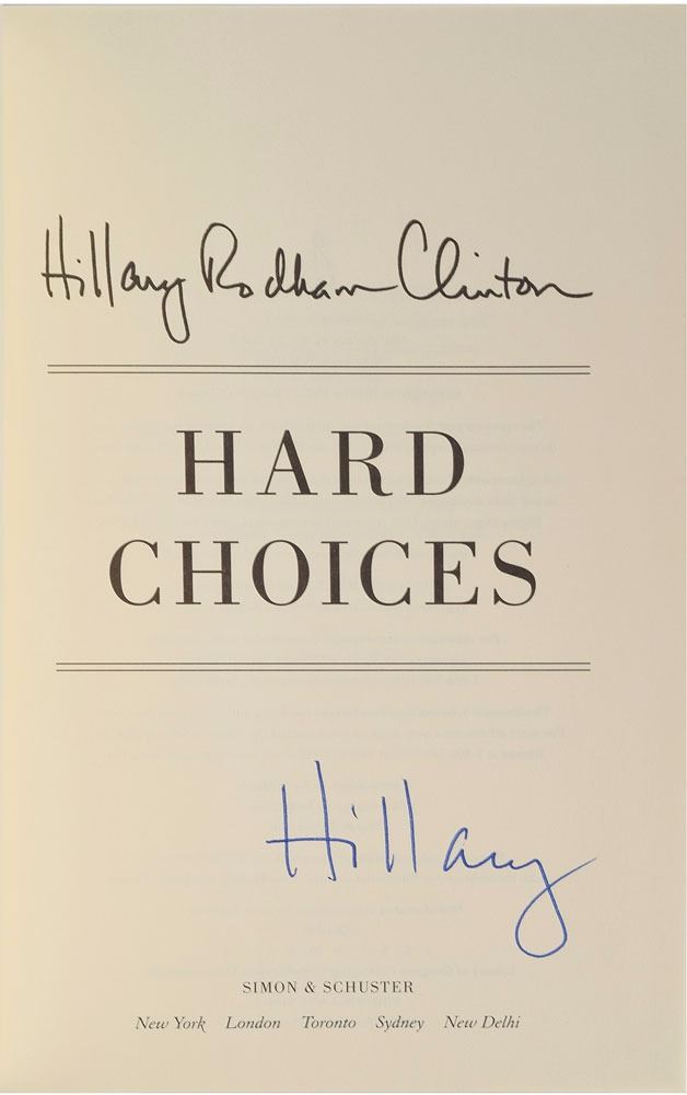 Two books: a later printing of My Life, hardcover with dust jacket, signed on the title page in black ink, "Thanks for your support, Bill Clinton, 9–12–2016"; and a first edition of Hard Choices, hardcover with dust jacket, signed on the title page in blue felt tip, "Hillary." In overall fine condition. Accompanied by a photo taken at the time of the Hillary signing.