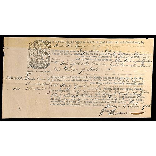 <Our item number 140064><B>Bill of Lading for the Brig Antelope.</B> Document printed on laid, watermarked paper, signed by William Atkinson, master of the Brig Antelope, 5 x 9 in., Baltimore, 18 Nov. 1786. The ship carried 48 casks of currants, eight cases of iron ware and one case of hats, bound for Charlestown, South Carolina. Graphics feature a clipper ship within a large 'S' with scrolled detailing. Light toning, else fine. <BR>Estimated Value $75 - 100. <BR><BR>Our item number 140064<BR><IMAGES><P ALIGN="CENTER"><IMG SRC="http://www.goldbergcoins.net/liveauction/49jpegs/140064.jpg"> </P></IMAGES>