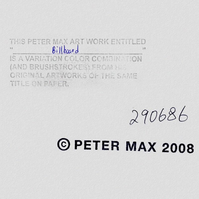 "Billboard Centenial" is a one-of-a-kind mixed media on paper, hand signed by Peter Max. The piece comes custom framed with a backside cutout to display Peter Max Studio registration number 290686 certifying authenticity. Measures approximately 48" x 36" (frame), 36" x 24" (image). This item requires special handling and may have a longer than usual turnaround.