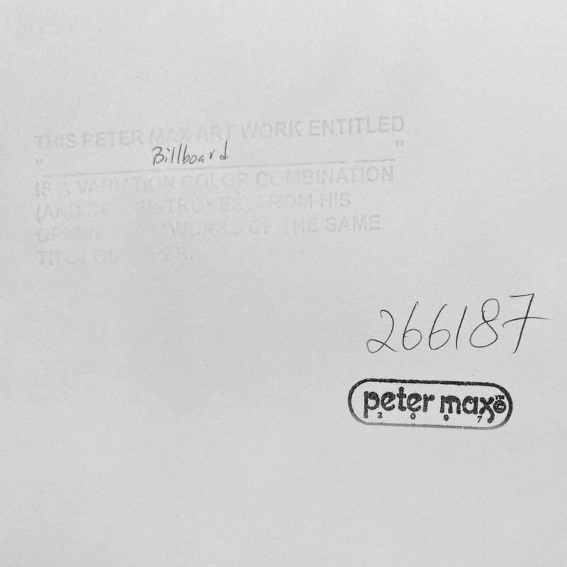 "Billboard Centennial" is a one-of-a-kind mixed media on paper, hand signed by Peter Max. The piece comes custom framed with a backside cutout to display Peter Max Studio registration number 266187 certifying authenticity. Measures approximately 48" x 36" (frame), 36" x 24" (image).