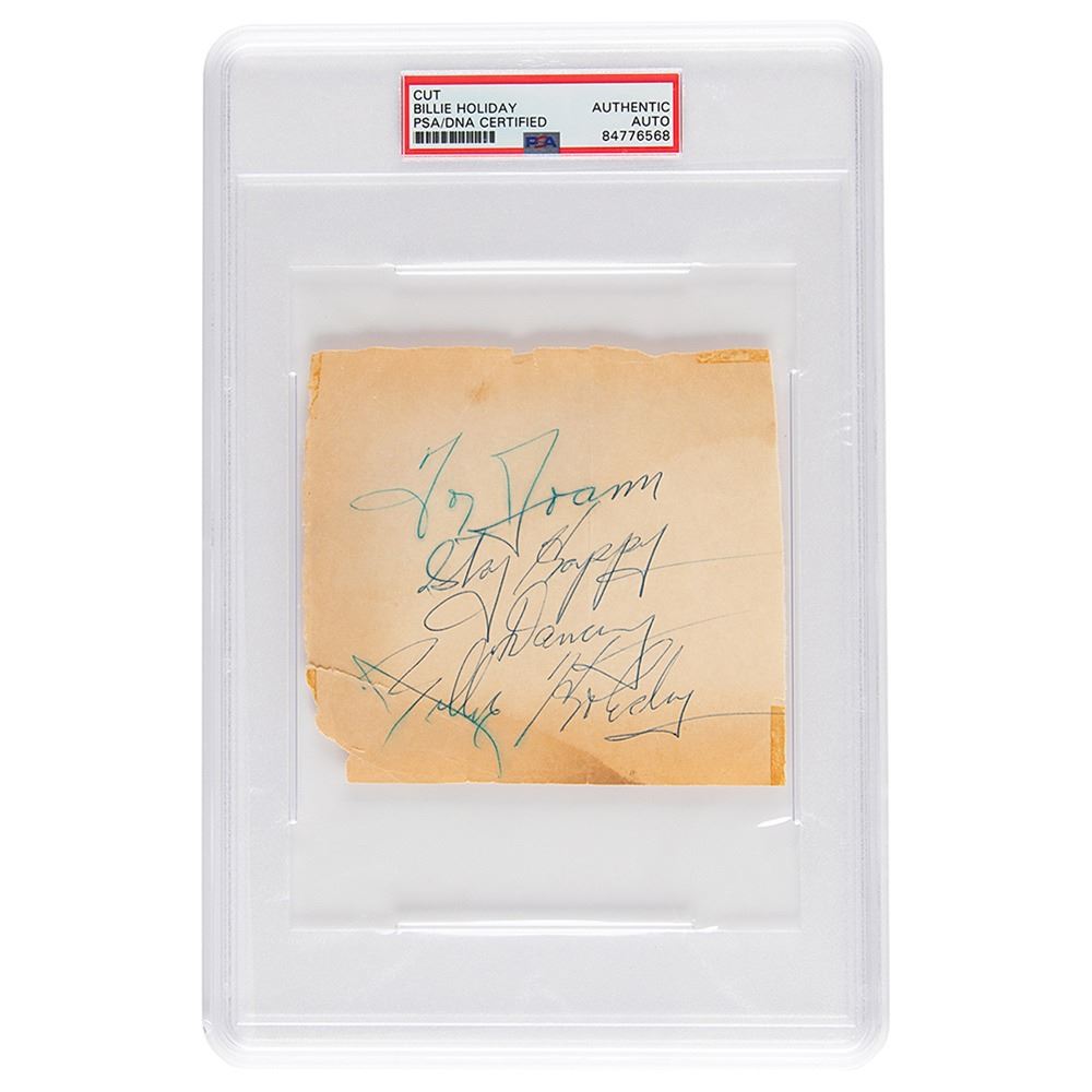 Vintage ballpoint signature and inscription, "To Joann, Stay Happy Dancing, Billie Holiday,& rdquo; on an off-white 4.5 x 4.25 sheet. In very good condition, with staining, irregular toning, and a tear touching the first letter of the signature. Encapsulated in a PSA/DNA authentication holder.