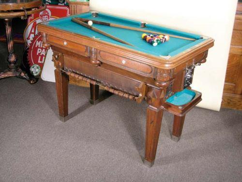 5 cent billiardette miniature pocket pool table. Walnut cabinet with ornate finials. 1930's comes with balls & cue sticks. Ex. cond.