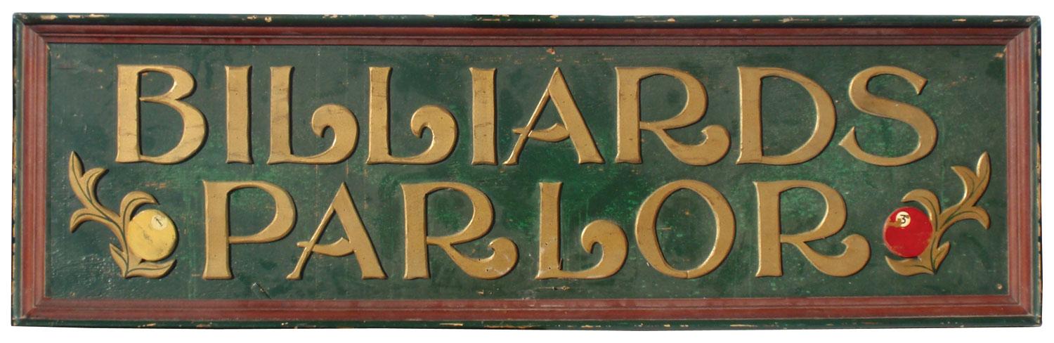 Billiards Parlor sign, large wooden sign w/fancy cutout letters (wood) in heavy contoured frame, Exc cond, 23"H x 76"W.