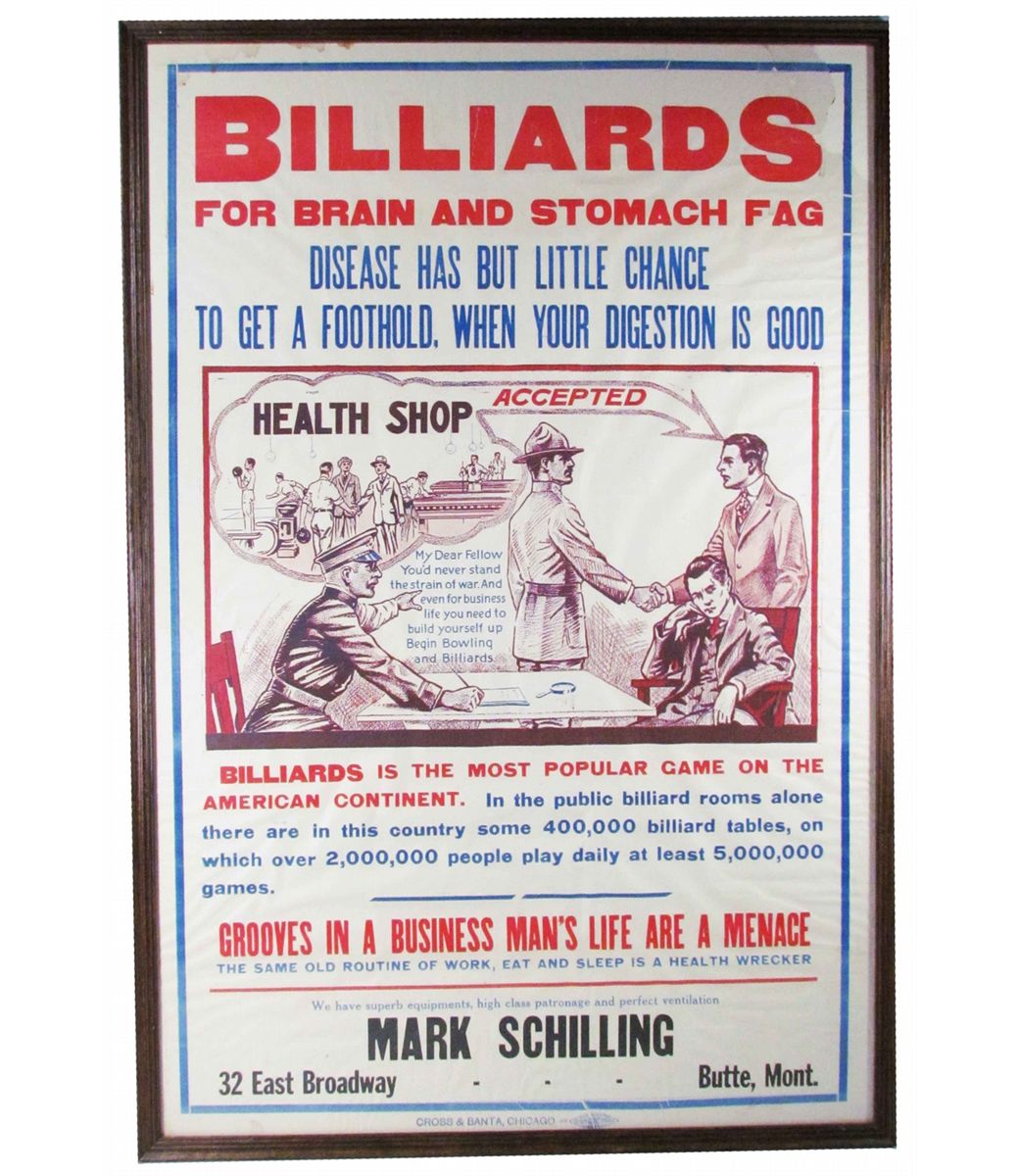 Billiards Poster, Butte Montana. Minor staining and folds otherwise good condition. Framed under glass. 28 X 42 inches image only.