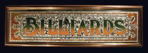 Billiards Reverse Glass Glue Chip Sign. This is one of the Reverse Glass Signs found at the Western Sand Blasting Co., in Chicago. Therefore, we are not sure of its age. Excellent condition. 12 X 40 inches including frame.