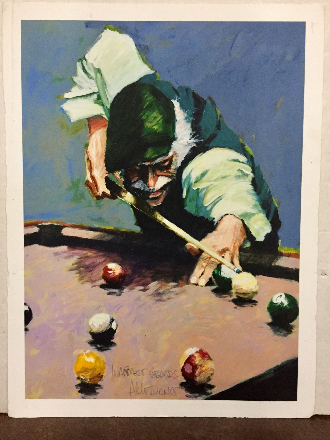 Description: Presented for your consideration we offer for sale this lithograph art featuring an older gentleman playing billiards. It is signed, “Warmest Regards" and the artist original signature. Aldo Luongo was known for his unique art over the past four decades. Maker: Aldo Luongo. Approx. Age: Vintage. Size: 16-3/4” x 22” tall. Condition: Good for its age, normal wear expected. Please look closely at the pictures - they are an important part of our description. Shipping: There will be a $10 handling / packaging fee for shipping this lot. The actual cost of postage will be added on top of that.