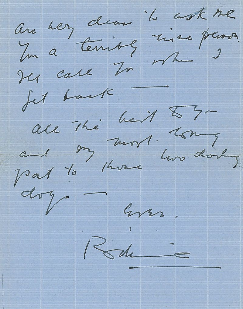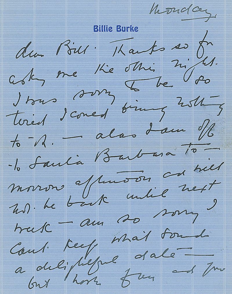 ALS signed “Billie,” one page both sides, 5.5 x 7, personal letterhead, no date. Apologetic letter to Bill. In part: “Thanks for asking me the other night. I was sorry to be so tired I could bring nothing to it—Alas I am off to Santa Barbara tomorrow afternoon…am so sorry I could not keep what sounds like a delightful date…I’m a terribly nice person.” In fine condition.