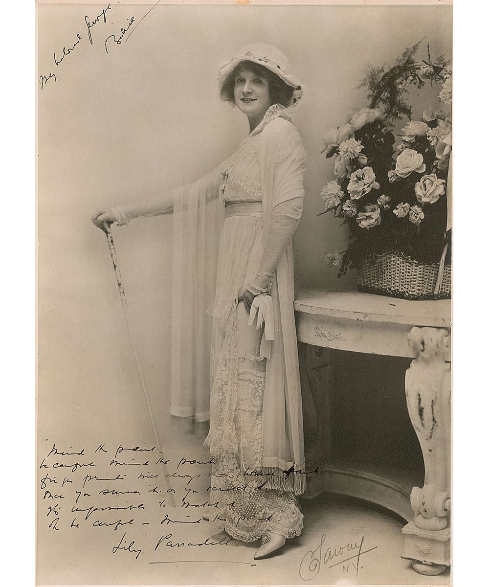 Oversized vintage matte-finish 10 x 13.5 full-length Sarony photo, signed and inscribed in fountain pen to George Cukor, “My beloved George, Billie.” At the bottom of the photo, Burke adds the chorus from the song, ‘Mind the Paint,’ which reads, “Mind the paint, be careful, mind the paint. Fingerprints will always show however faint. Once you smear it, or you scratch it, It's impossible to match it, Oh be careful—mind the paint,” signing her character name underneath, “Lily Parradell.” In fine condition, with two slightly trimmed edges, and a trivial spot to top border. In 1912, Burke appeared in 136 performances of Arthur Pinero’s four-act play, Mind the Paint Girl at New York’s Lyceum Theatre. It was Cukor who directed Burke in her 1932 comeback film, A Bill of Divorcement, which was also Katharine Hepburn’s film debut.