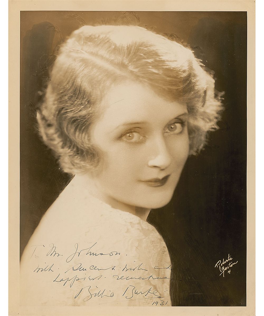 Lovely vintage glossy 11 x 14 photo of Burke glancing over her shoulder, beautifully signed and inscribed against her light shirt in fountain pen, “To Mr. Johnson, with sincerest wishes and happiness. Remembrance, Billie Burke, 1931.” Light scattered creases and moderate areas of discoloration, otherwise fine condition.