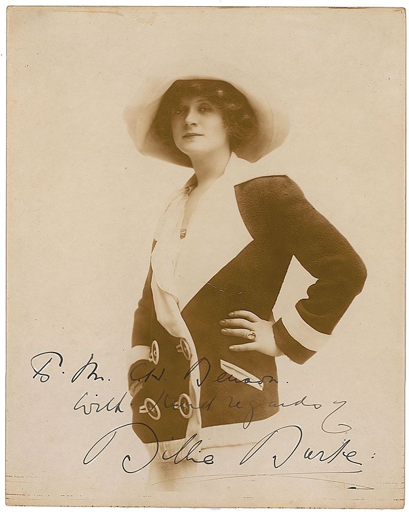 Vintage pearl-finish 8 x 10 double-weight photo, signed and inscribed in fountain pen, “To Mr. C. H. Denson, with kind regards of Billie Burke.” In fine condition, with a bit of light toning along top edge.