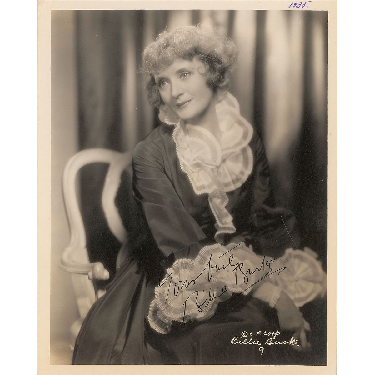 Prolific American actress (1884–1970) best known for her role as Glinda the Good Witch of the North in The Wizard of Oz. Lovely vintage matte-finish 8 x 10 photo of Burke in a frilled dress, signed in fountain pen, “Yours truly, Billie Burke.” The photo bears a “1935” collector’s notation to the top edge. In fine condition, with creases to upper left corner.